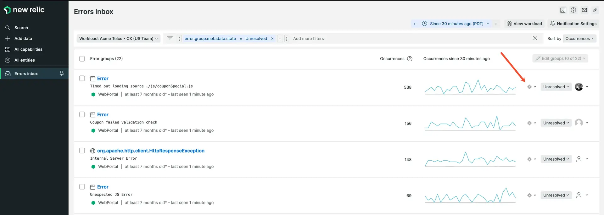 - Click on the Jira integration icon on the far right side of the error group you want to connect to Jira.