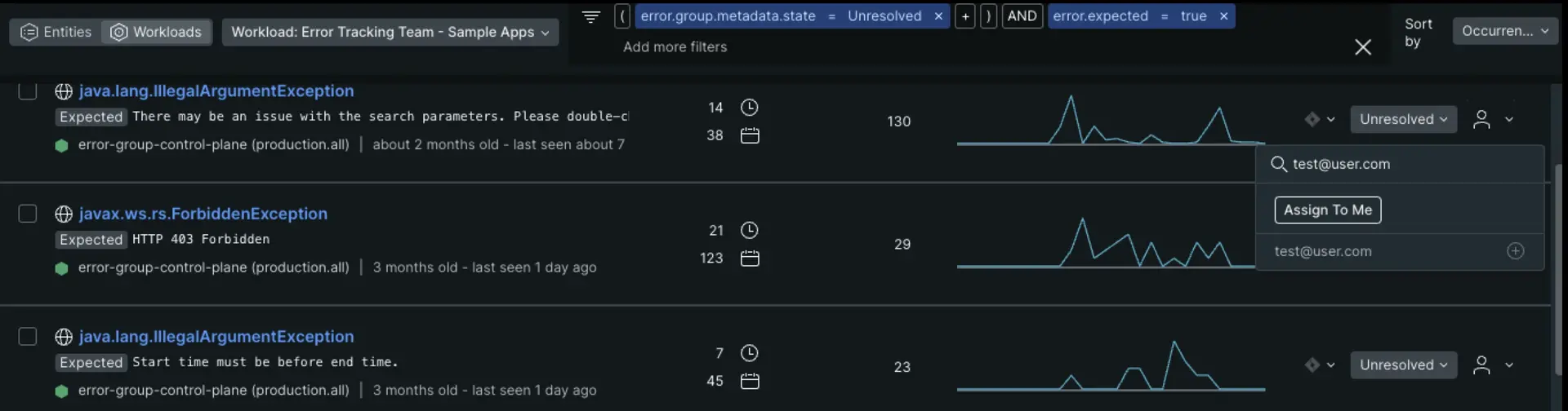 A screenshot that highlights the right side of an error group where the assigned user dropdown is.