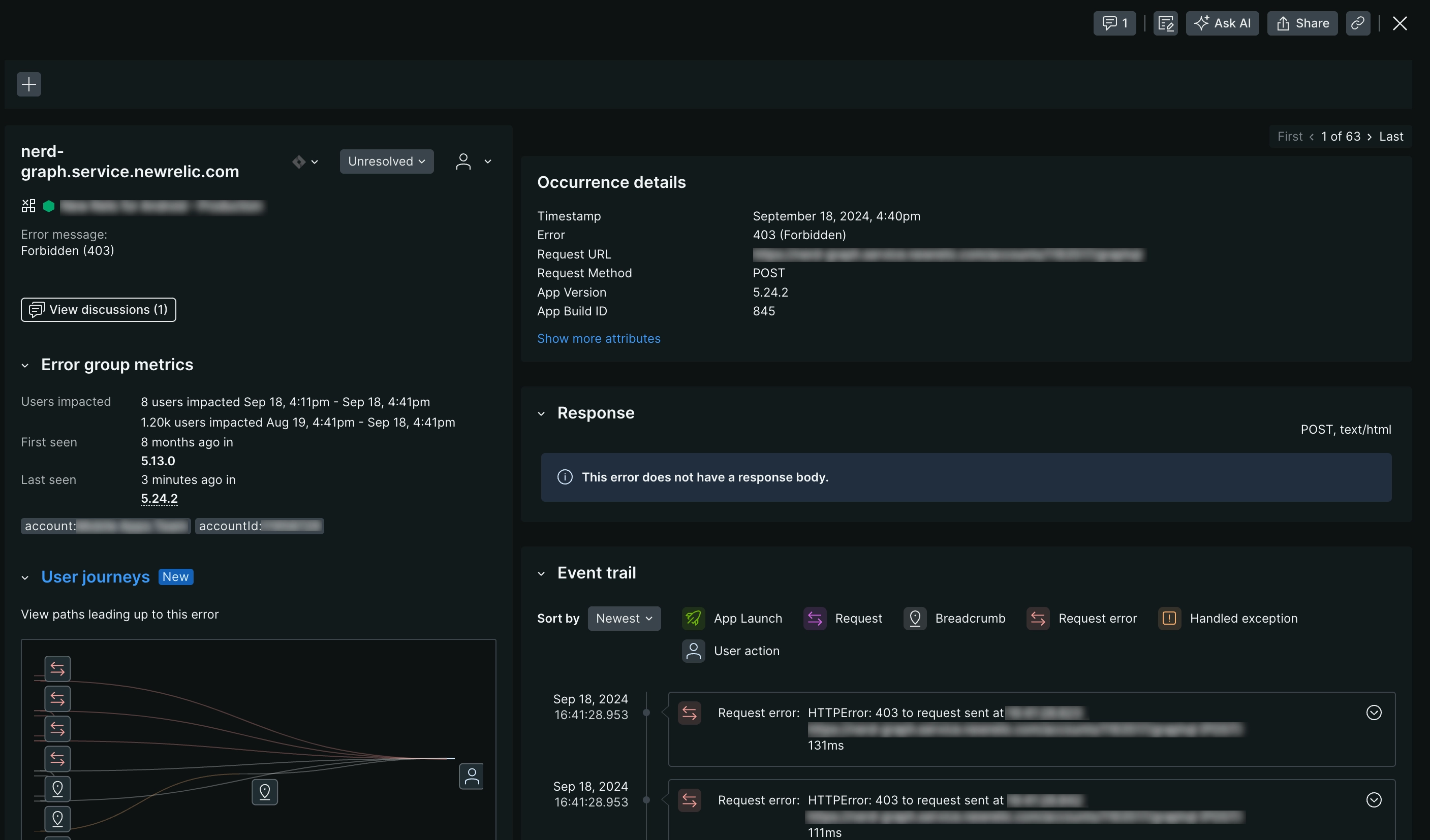 one.newrelic.com > All capabilities > Mobile > Request errors > (Select a request error): From the request errors details page you can dig deeper into the events that led up to a specific error using our event trail.