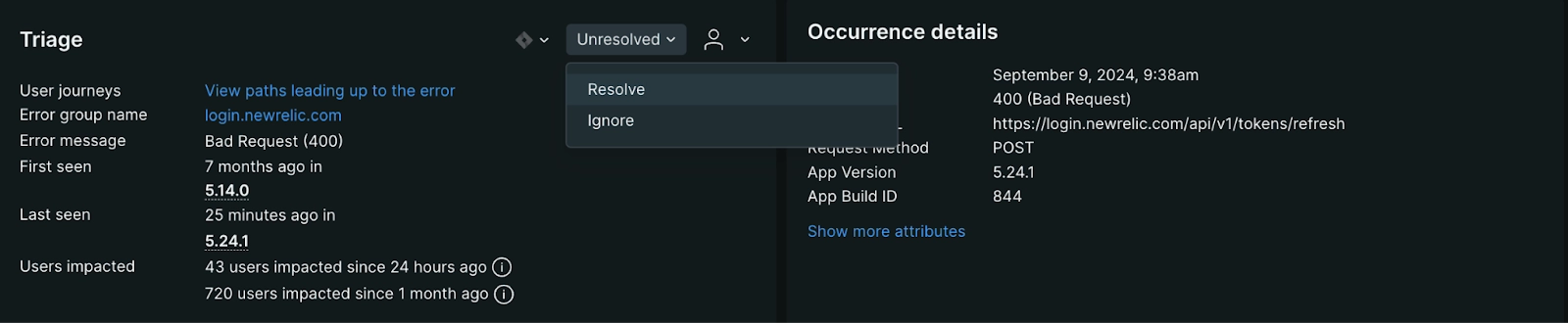 • Update error status: Mark the request error as Resolved or assign it to a specific team member who can own and examine the issue, and then deploy a fix.