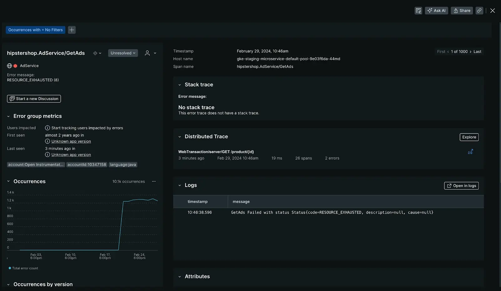 If you've set up distributed tracing, and if there are sampled traces related to errors, you'll see options to view trace details. This is a quick way to view trace information without going to the main distributed tracing page.