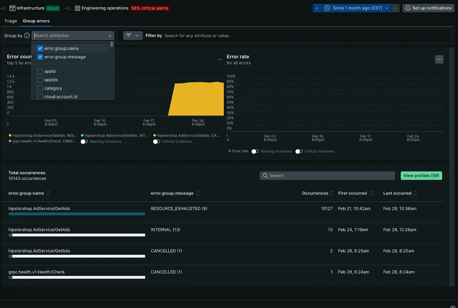 With Group errors tab, you can dynamically filter and group errors for deeper analysis. Group errors shows you where your OpenTelemetry errors are happening, and provides tools to help you determine the root cause.