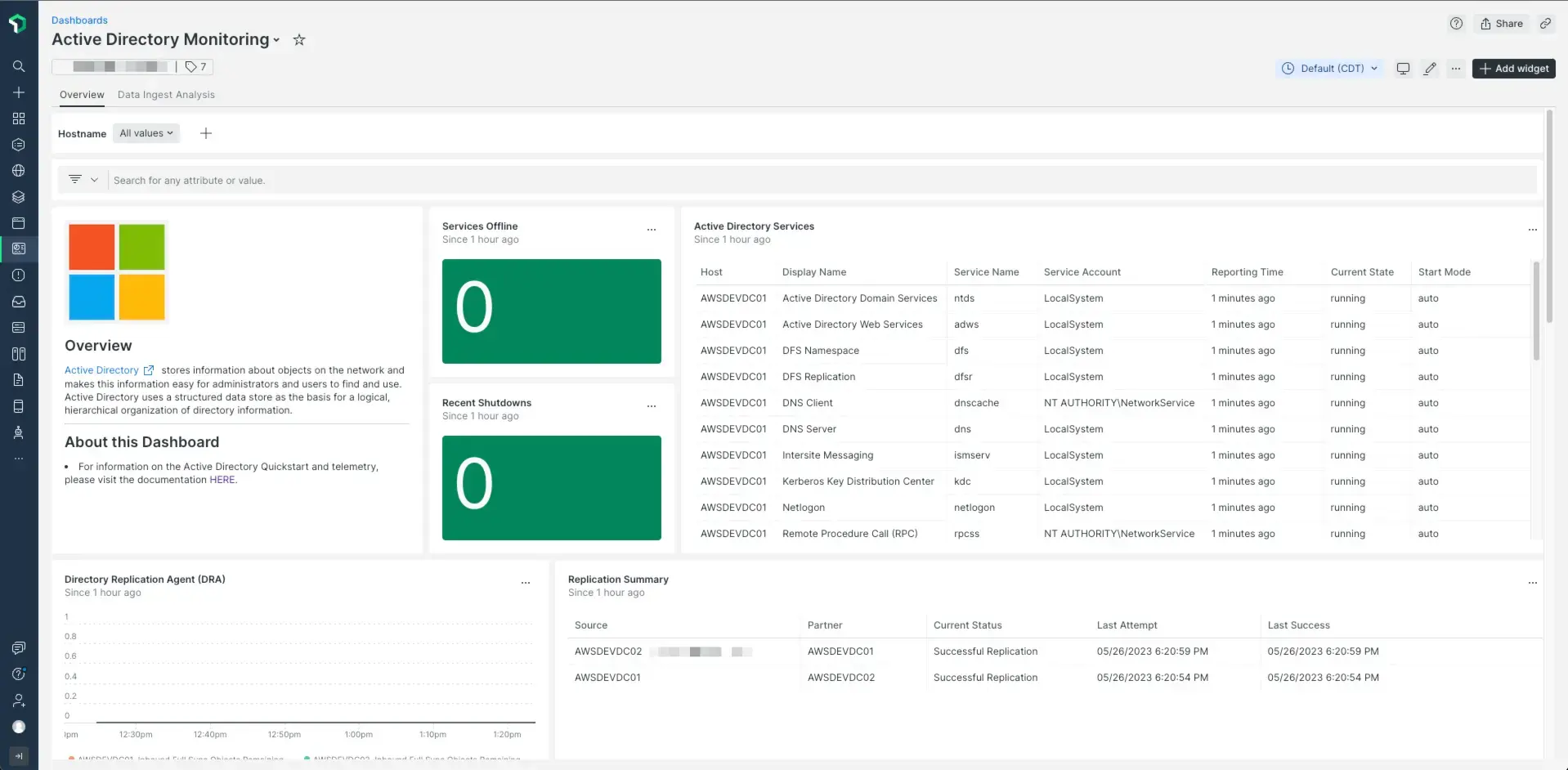 Install the Active Directory quickstart from the New Relic I/O catalog to add the relevant dashboard and alerts.
