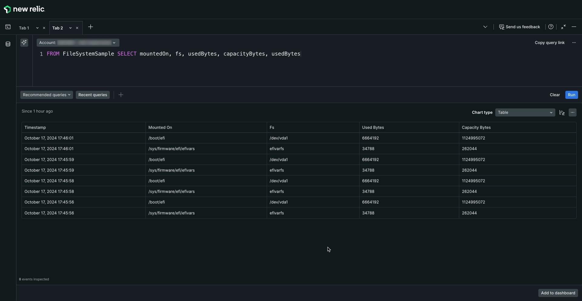 FROM FileSystemSample SELECT mountedOn, fs, usedBytes, capacityBytes, usedBytesThe query should give a table similar to this: