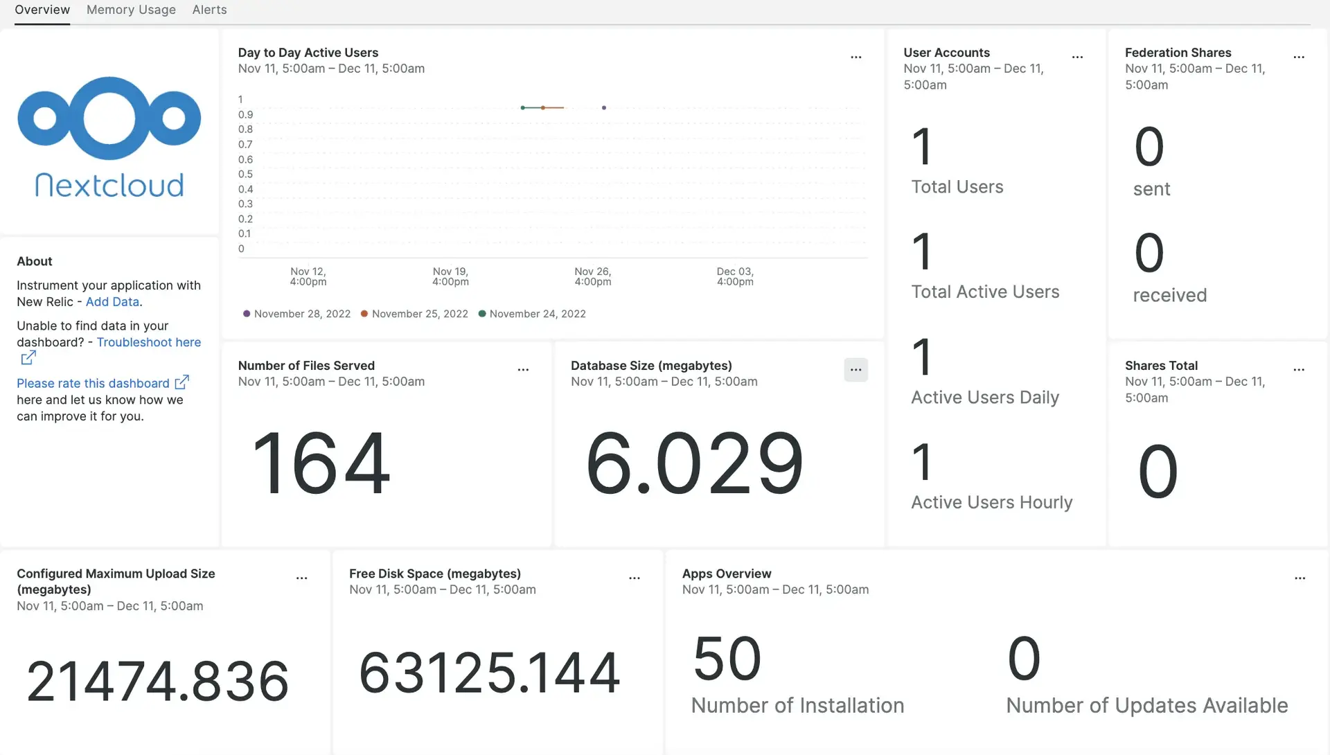 After setting up the Nextcloud integration with New Relic, your data displays in dashboards like these right out of the box.
