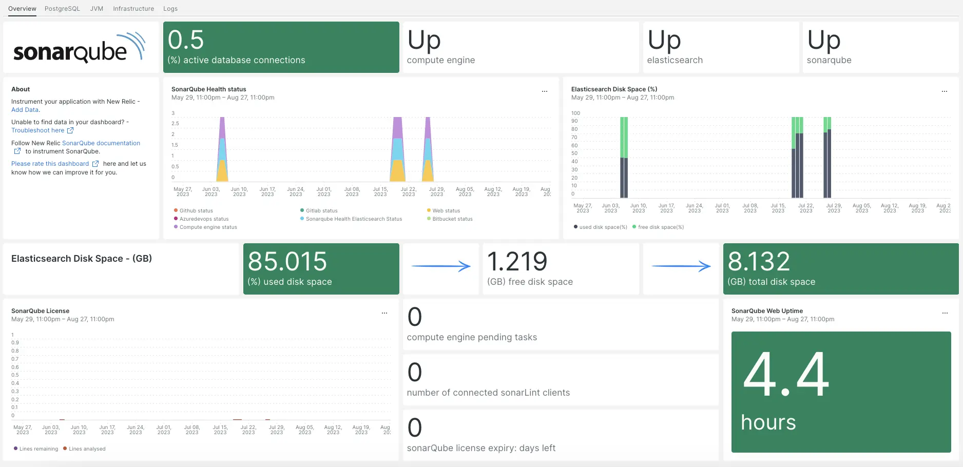 Our SonarQube integration monitors the performance of your SonarQube application, helping you diagnose and optimize the code. Our SonarQube integration makes use of our infrastructure agent, PosgreSQL integration, NRI-Prometheus, and NRI-JMX and gives you a pre-built dashboard with your most important SonarQube metrics.