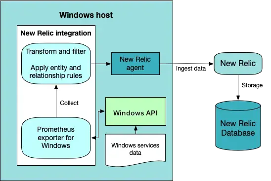 To get data from Windows hosts, our Windows services integration uses a reduced version of the Prometheus exporter for Windows, which exposes Prometheus metrics on the port specified in the agent configuration. The integration collects these metrics, transforms them into entities, filters them, and then sends them to New Relic.