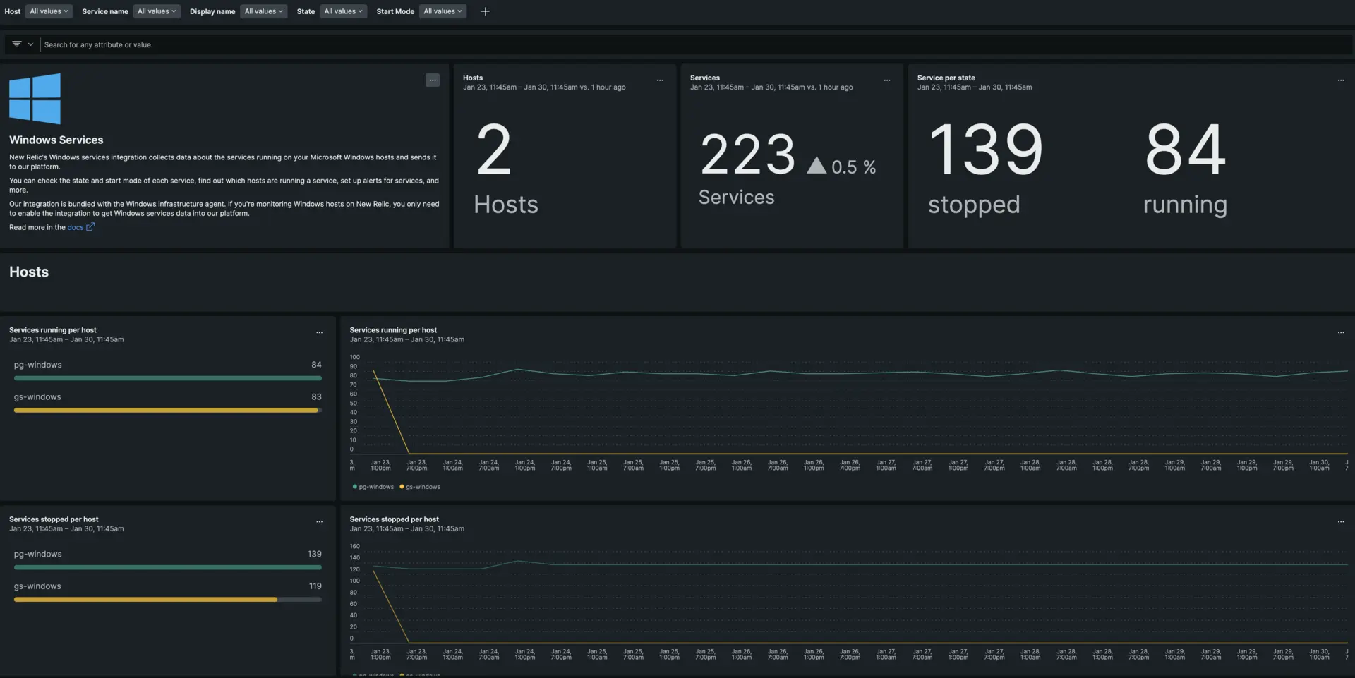 New Relic's Windows services integration collects data about the services running on your Microsoft Windows hosts and sends it to our platform. You can check the state and start mode of each service, find out which hosts are running a service, set up for services, and more.