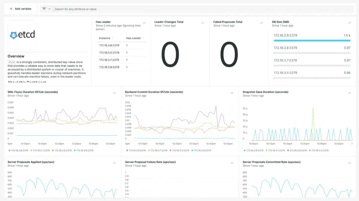 Use New Relic to display a curated dashboard based on Prometheus metrics which helps you understand the health of your Etcd cluster. With New Relic you can monitor:
