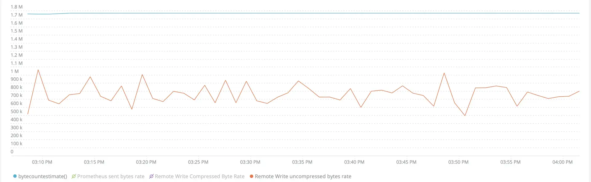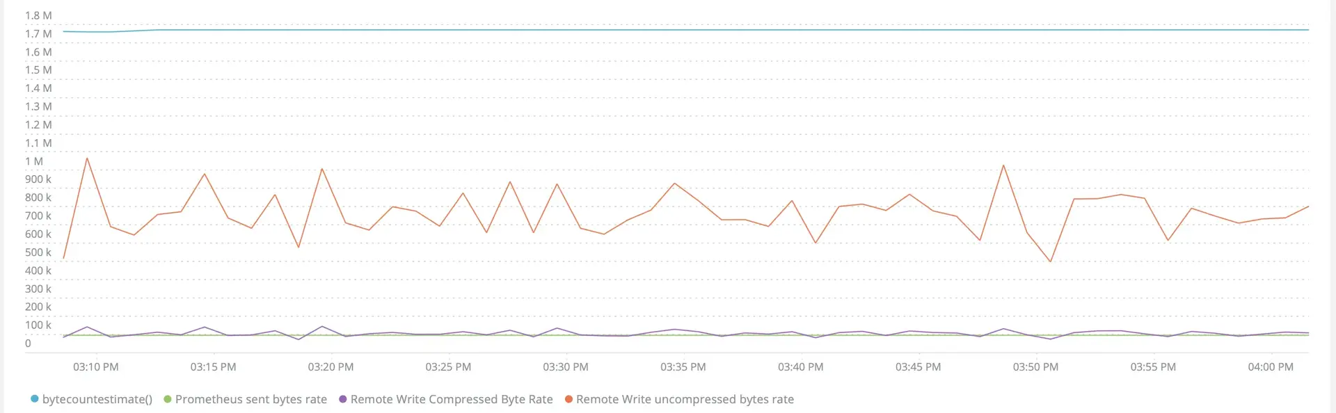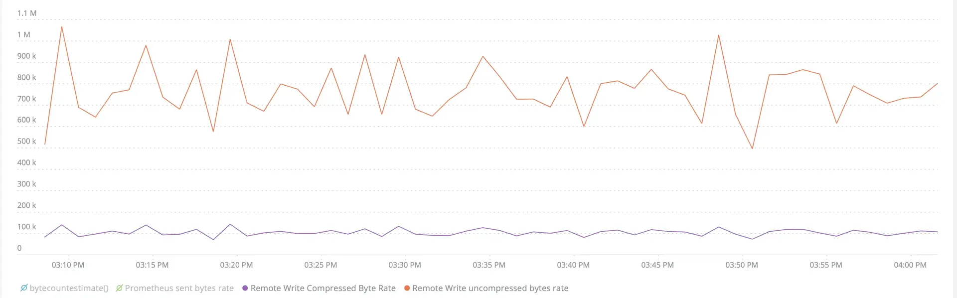 As the data points are uncompressed, the 5-10x expansion factor is reflected in the difference between the remote write compressed data byte rate and the remote write uncompressed bytes rate, which are measurements taken right before and after data decompression.