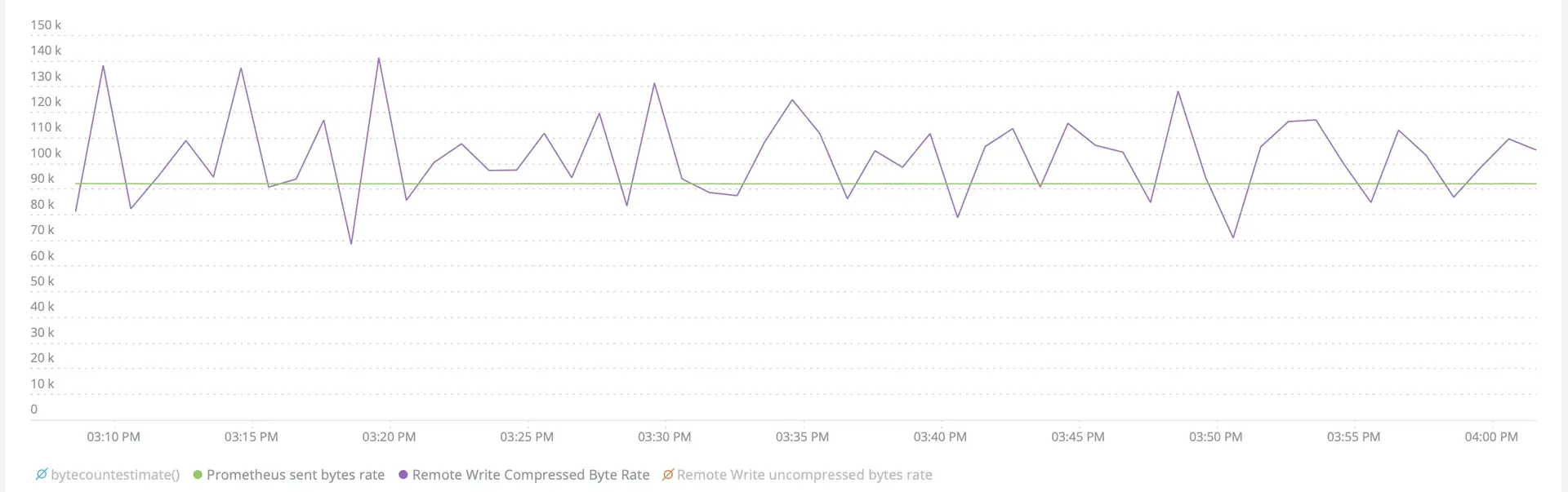 Note how the Prometheus sent byte rate closely matches the remote write compressed bytes count that we record on our end just before uncompressing the data point(s). We can attribute the increased variance of the remote write compressed byte rate to the nature of processing the data through our distributed systems: