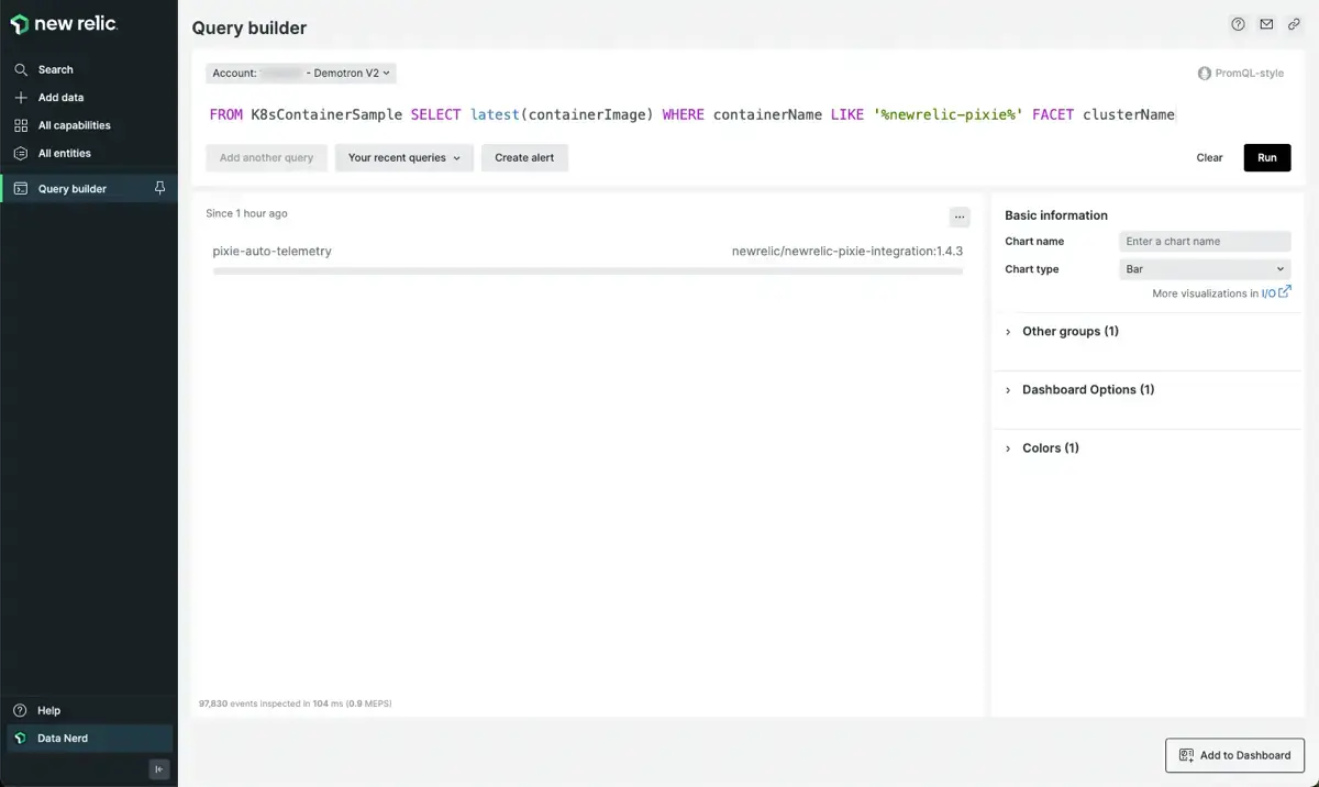 Use the query builder to determine which version of the New Relic Pixie integration is installed.