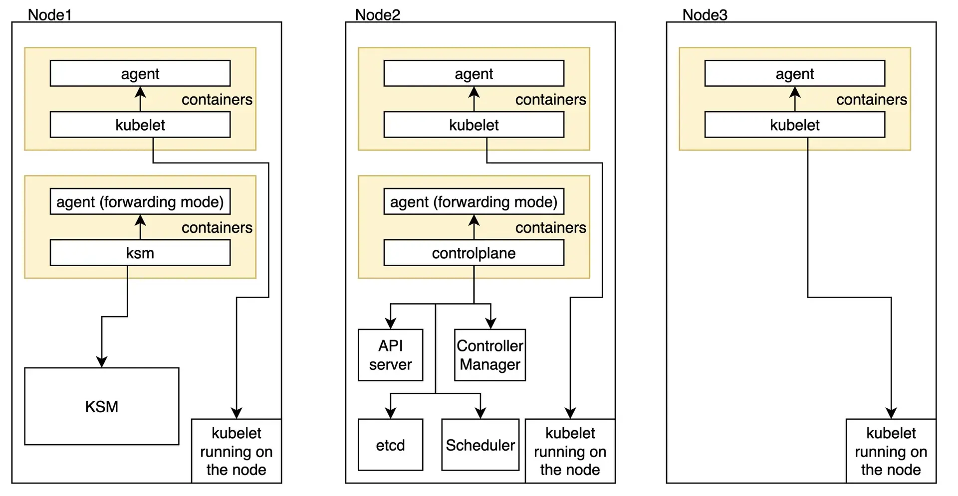 The agent in the kubelet component is also in charge of scraping node data and running integrations. The diagram below shows the integration installed in a cluster with three nodes.
