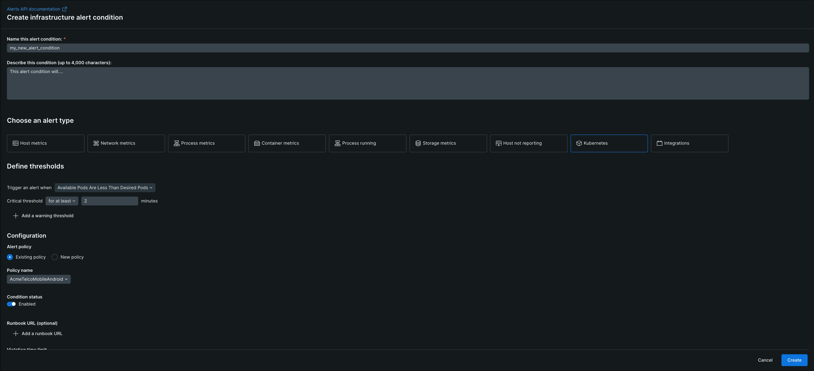 Create a Kubernetes alert condition