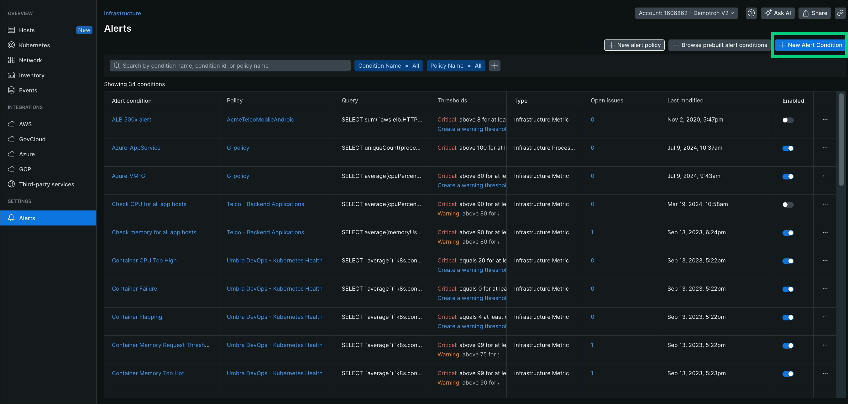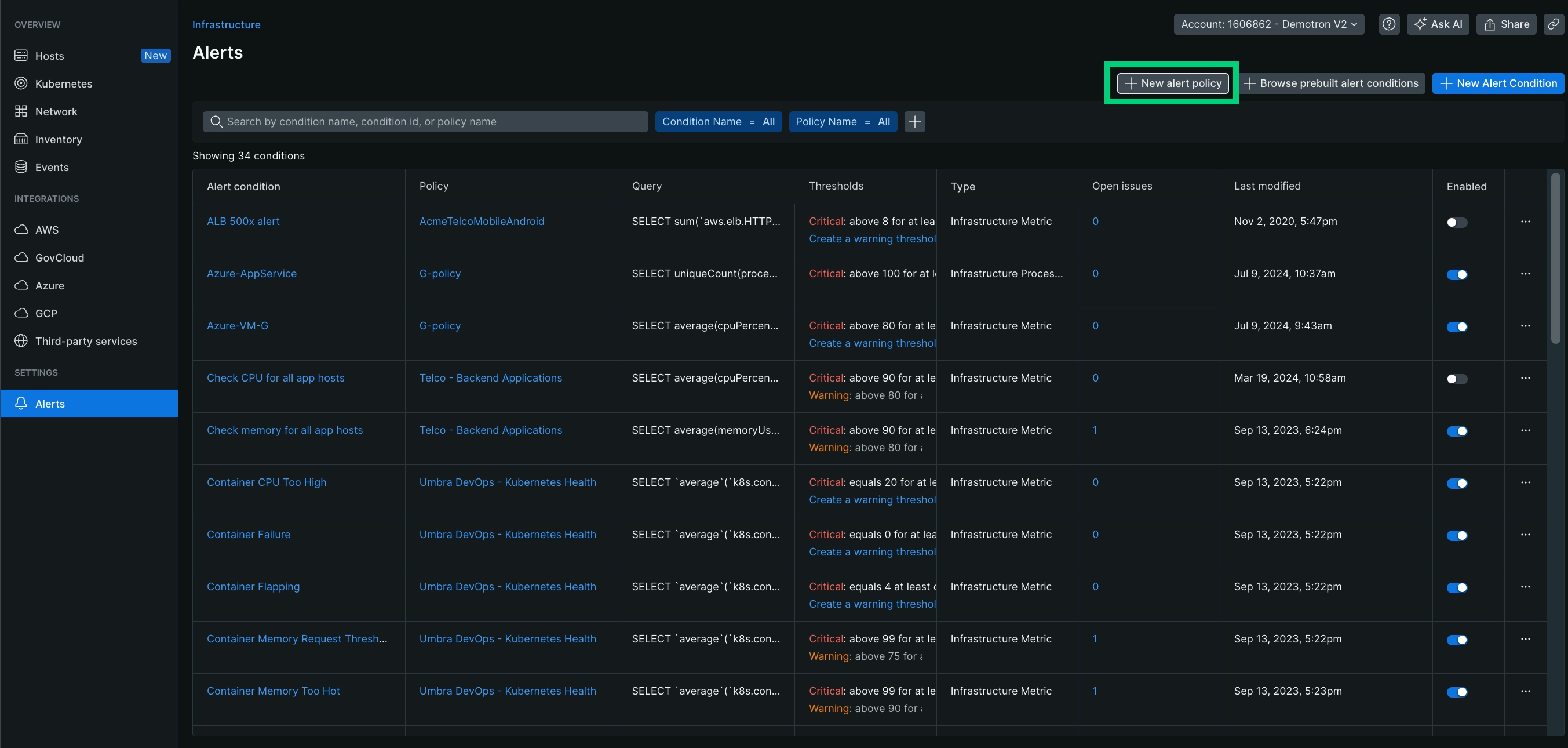 Go to one.newrelic.com > All capabilities > Infrastructure and click Alerts on the left navigation pane.