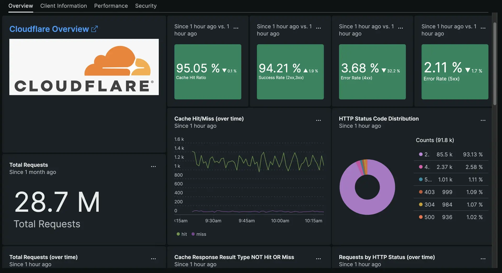 Get started in minutes with a pre-built dashboard to see key metrics from your Cloudflare network logs.