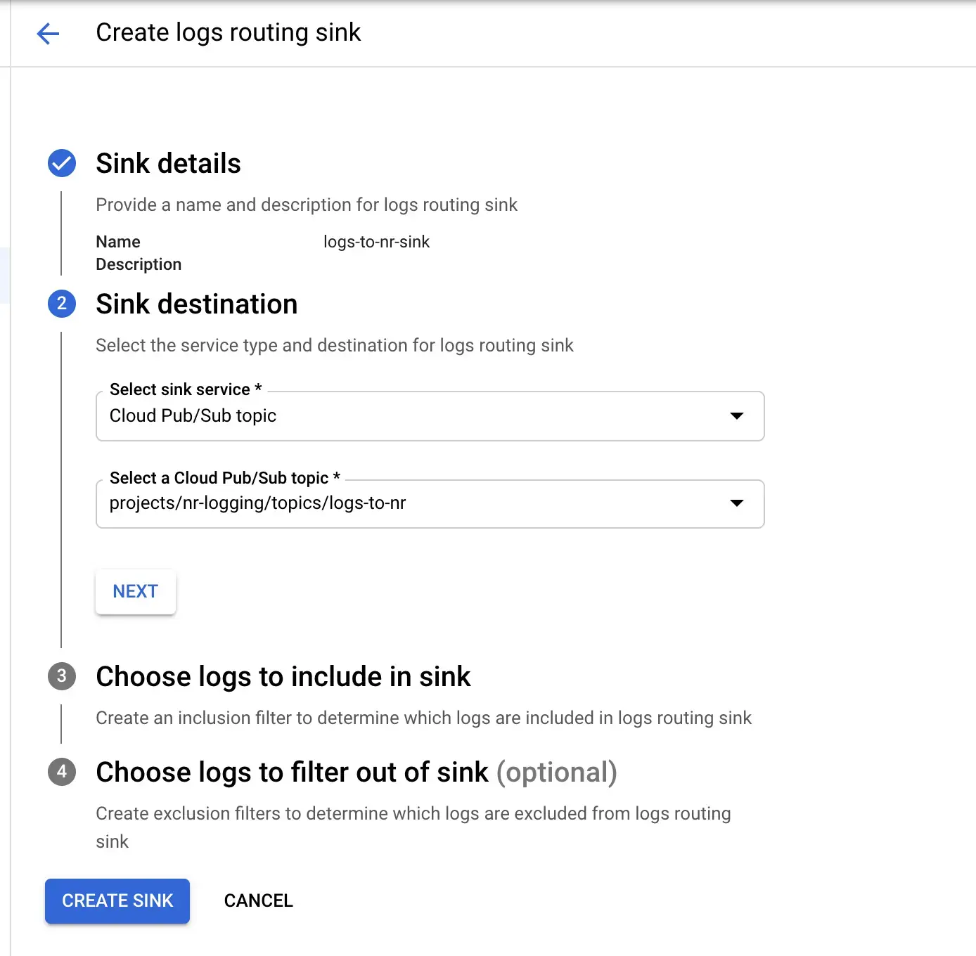 Configure remaining filters as needed, then click Create sink to complete setup.