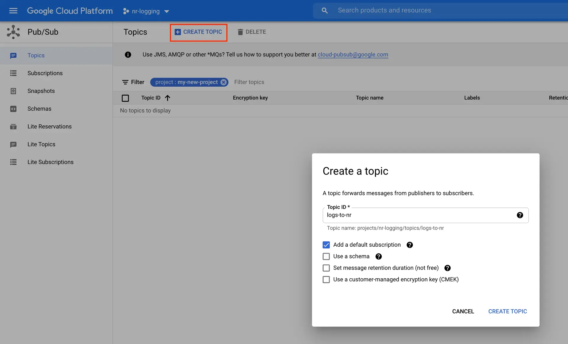 Under Select sink service, select Cloud Pub/Sub topic, and select the Pub/Sub topic you previously created.