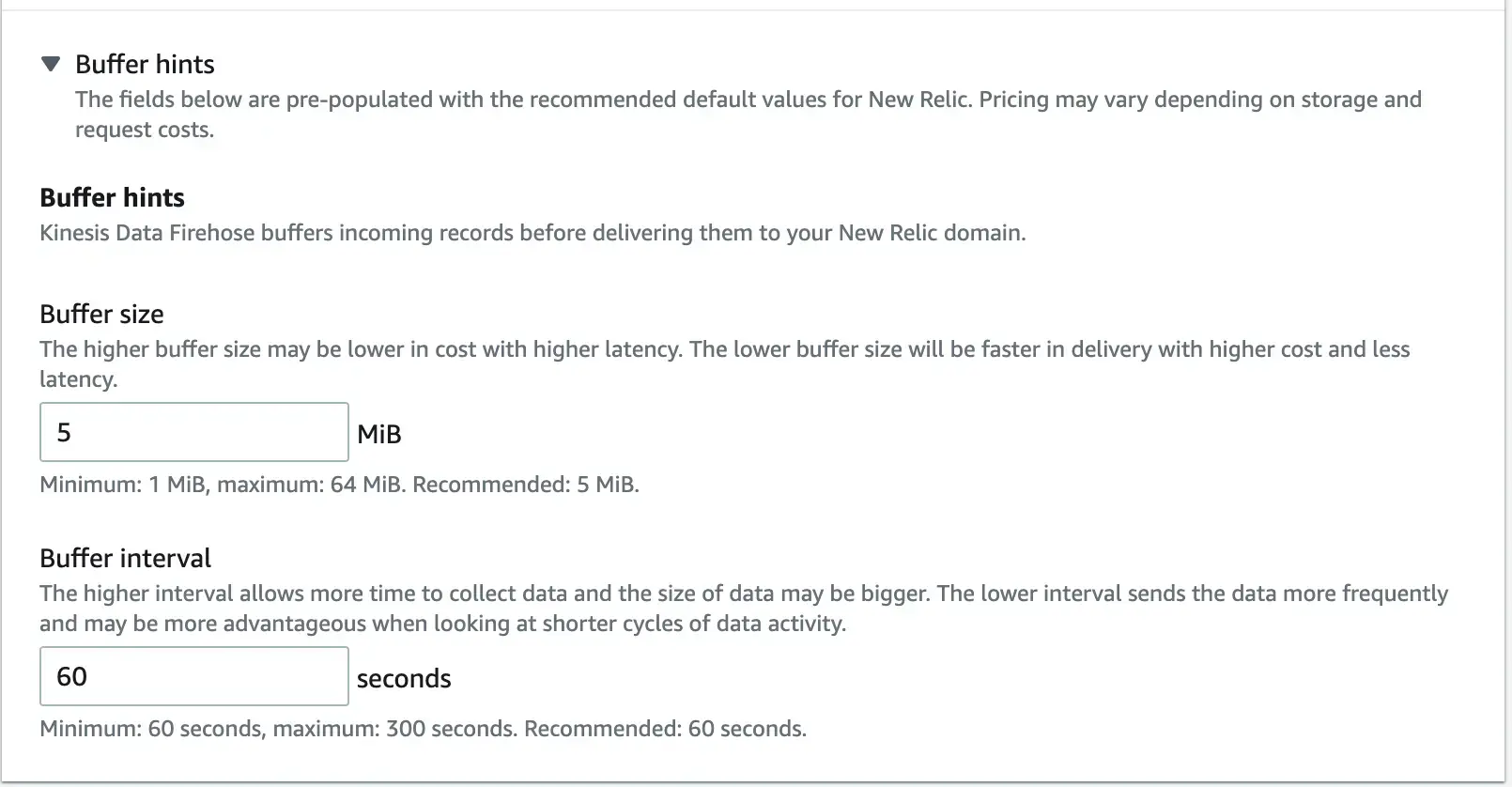 The default values are 5 MiB for Buffer size, and 60 seconds for Buffer interval. This means that Firehose accumulates logs until either they contain 5 MiB of data, or until 60 seconds have passed since the last time they were flushed to New Relic.