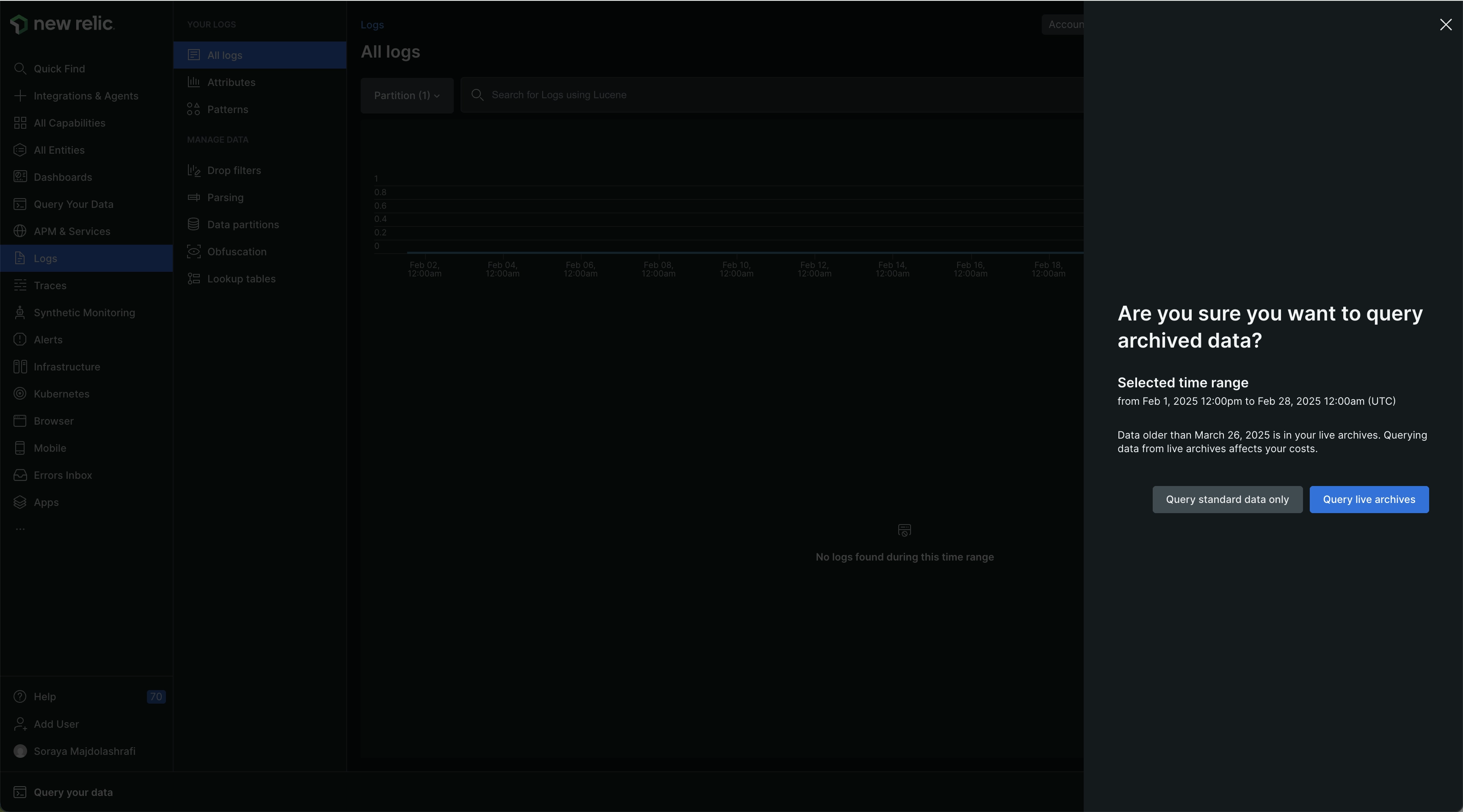Go to one.newrelic.com > All capabilities > Logs to query data stored with live archives.