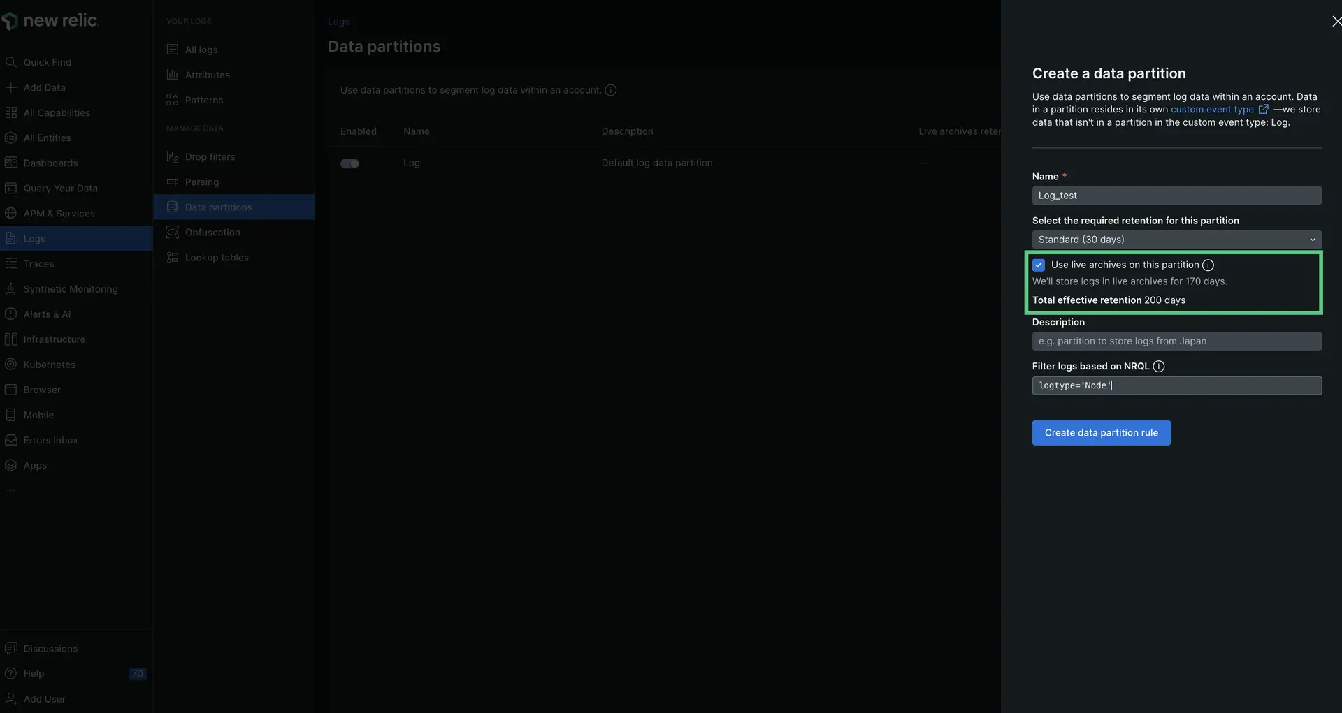 Go to one.newrelic.com > All capabilities > Logs > Data partitions to create a partition using live archives.