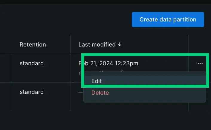You can also edit an existing partition clicking the icon on the Data partitions page. If you use an existing partition, the same parameters that you selected for the original partition will apply to your live archive data.