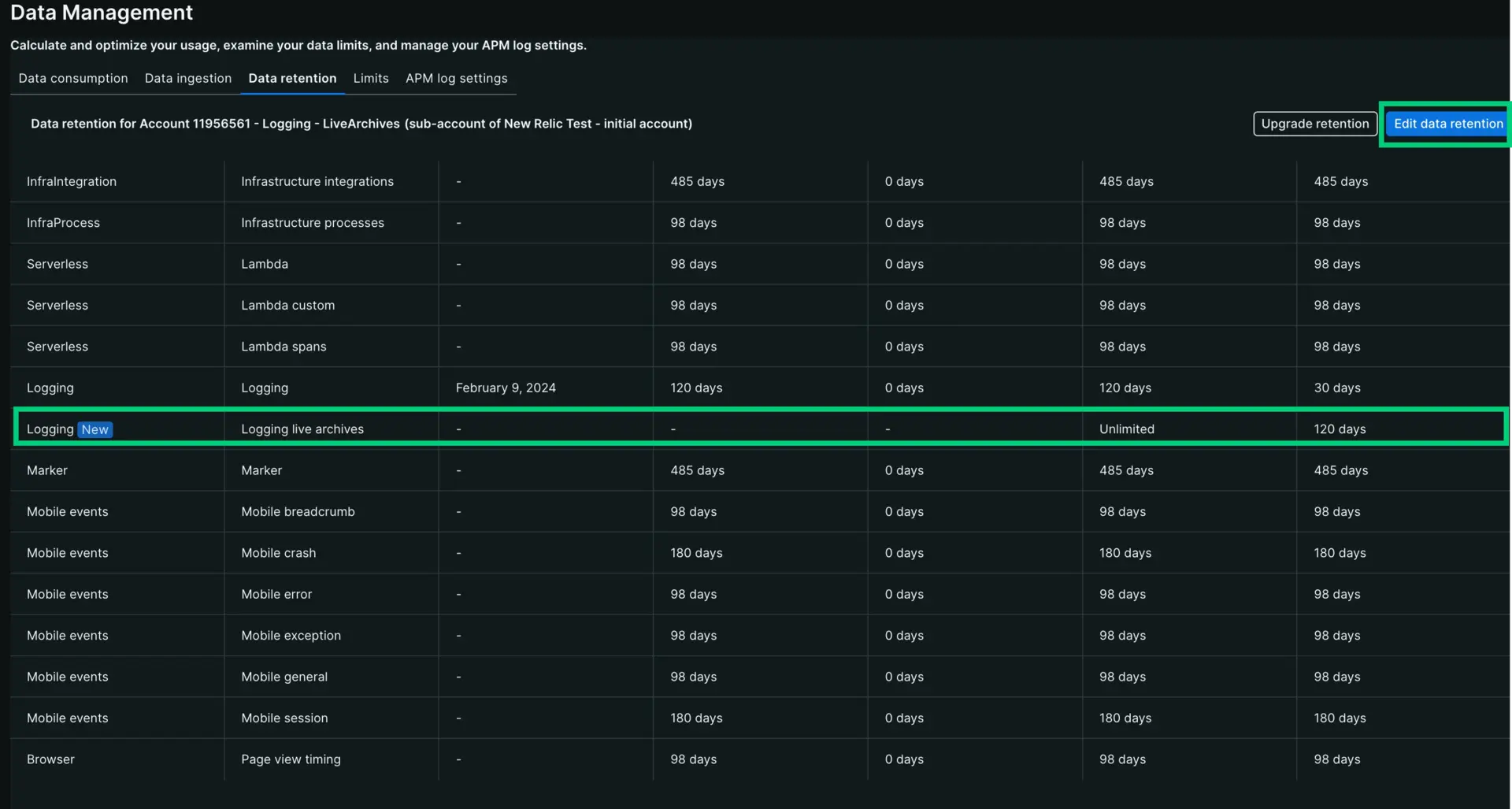 Scroll down to Logging live archives and enter the total number of days you'd like your data stored. Keep in mind that this includes the standard retention days.