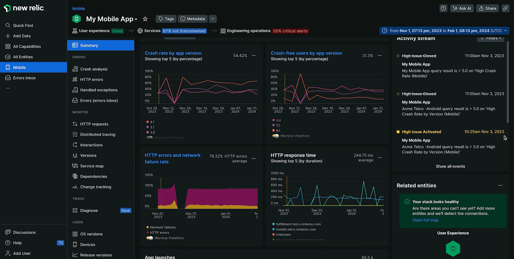 one.newrelic.com > All capabilities > Mobile > (select an app): The summary page provides high-level performance data and a landing base to drill down into specific metrics or issues.