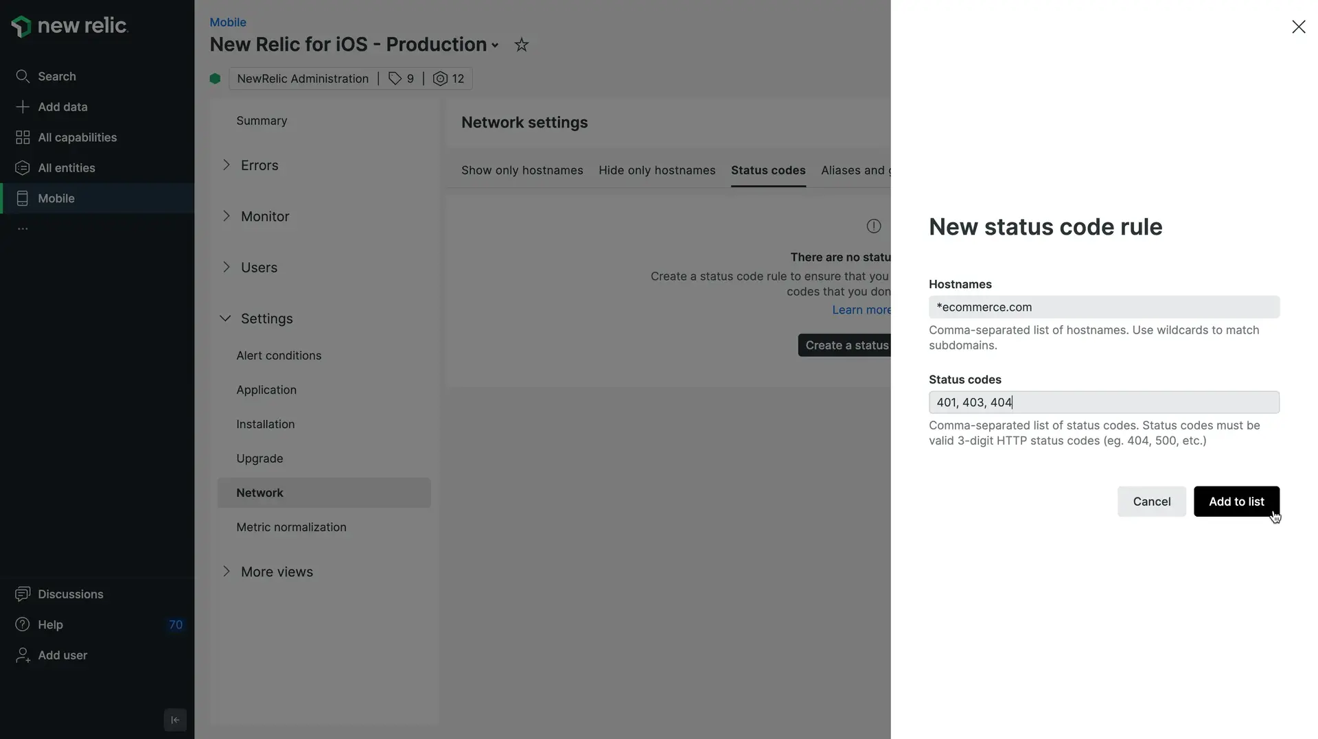 The mobile network request settings page can help you customize how network metrics and events are reported. You can block or allow hostnames, ignore HTTP status codes from certain hosts, and create aliases to rename hosts or group subdomains.