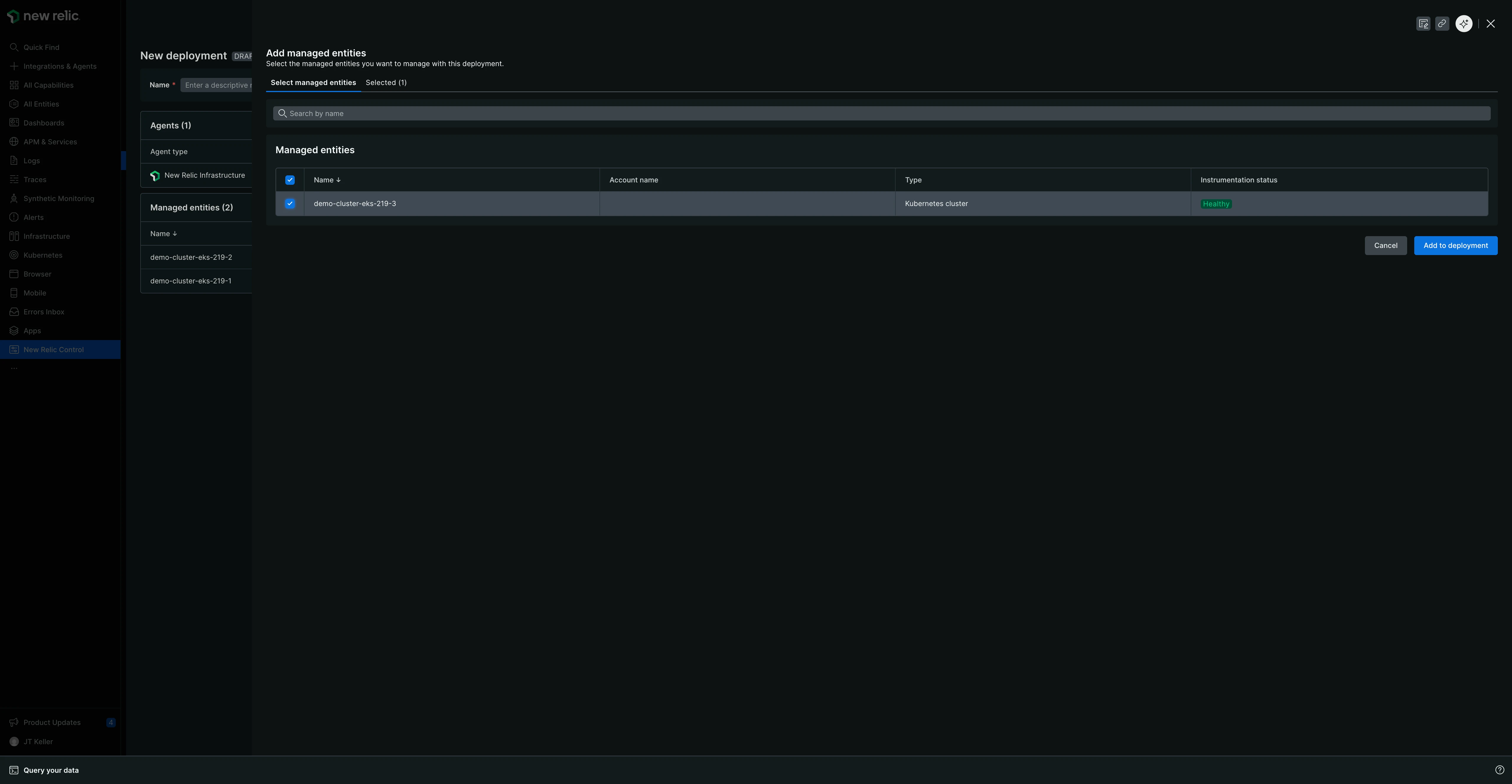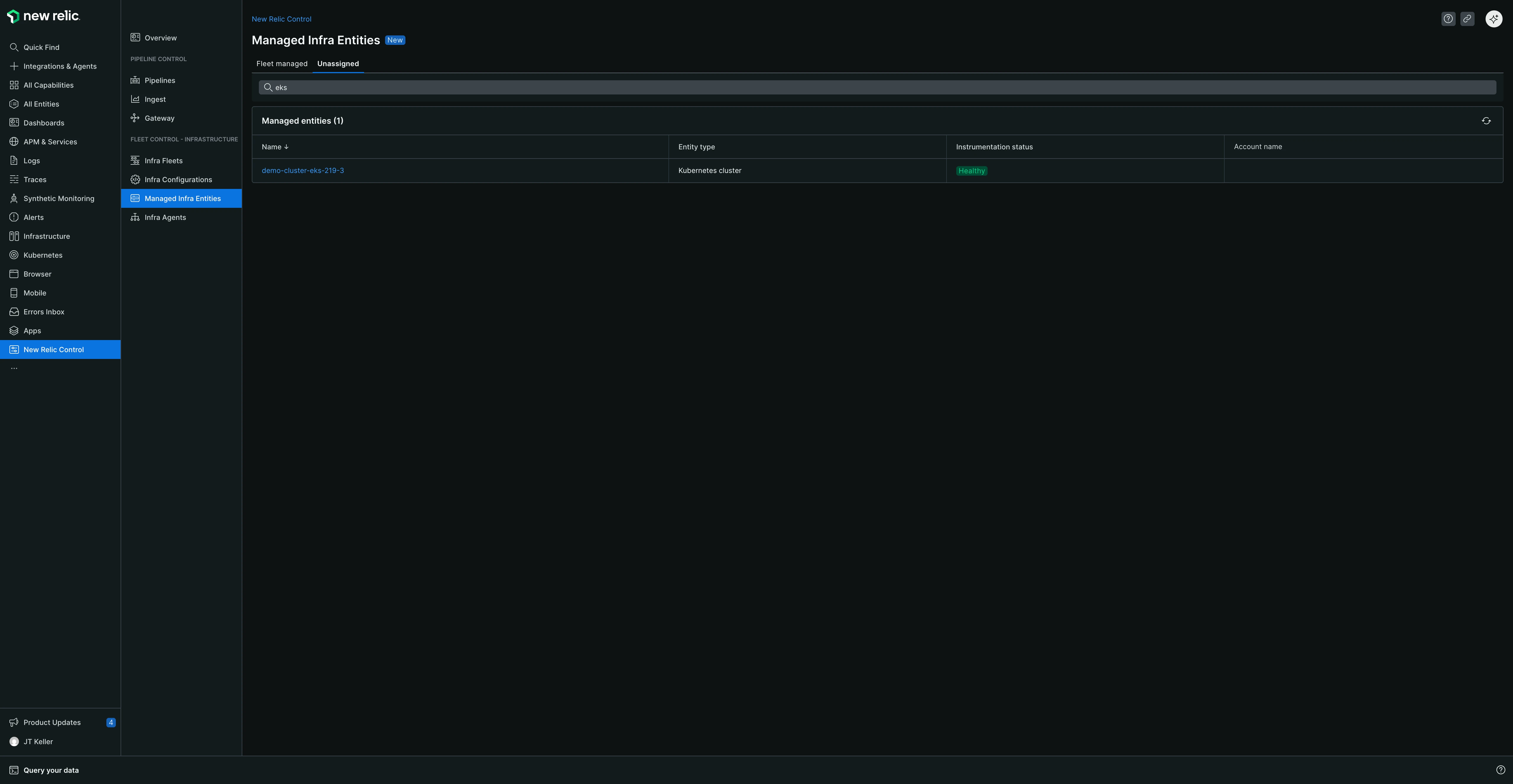 When you navigate to New Relic Control β Managed Entities, you get a centralized view of all your managed entities, which are Kubernetes clusters or hosts with Agent Control installed. This page serves as your complete asset inventory for any entity capable of being managed by Fleet Control and is organized into two tabs: Fleet managed and Unassigned.