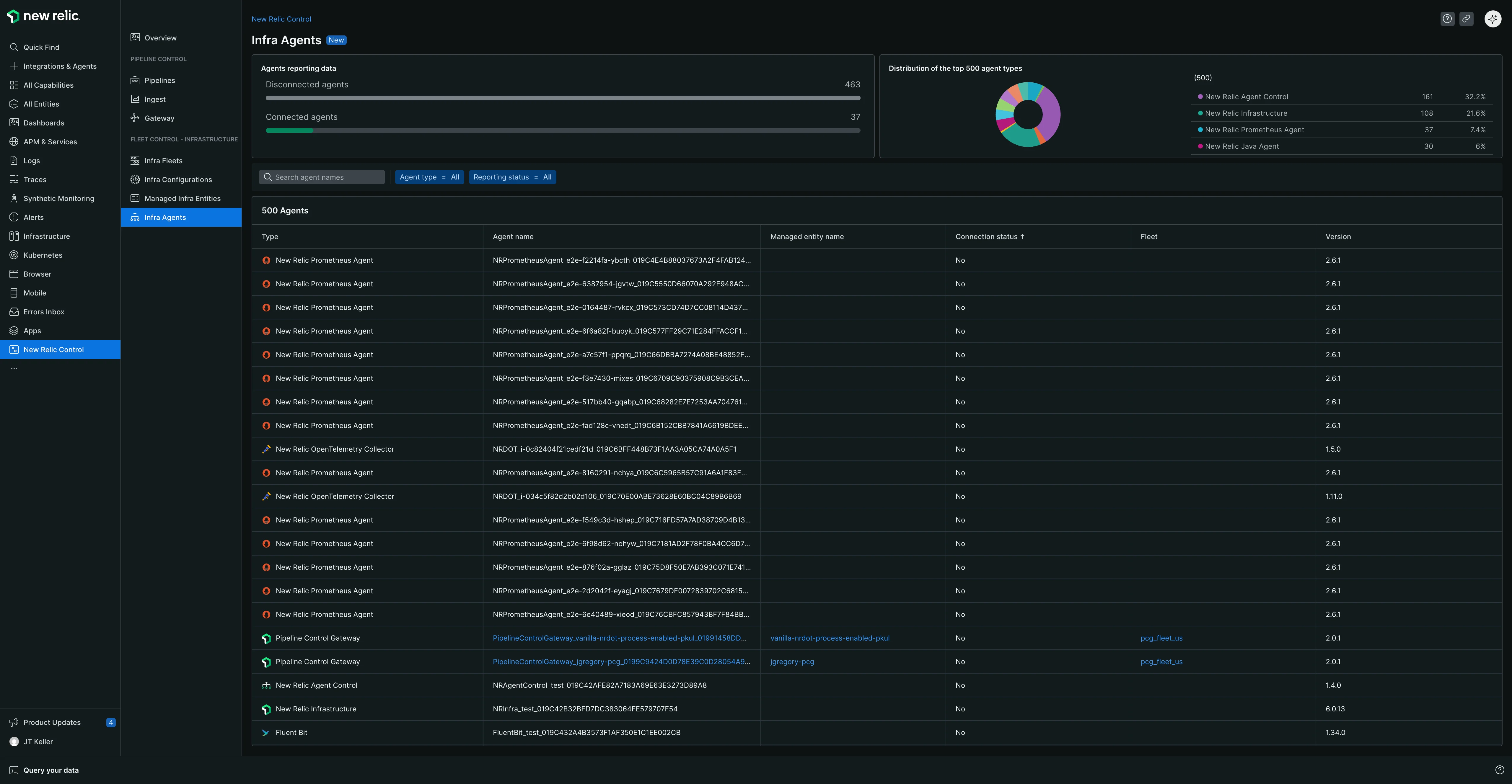 When you navigate to New Relic Control β Agents, you get a global overview of all the agents being managed by Fleet Control across your organization.