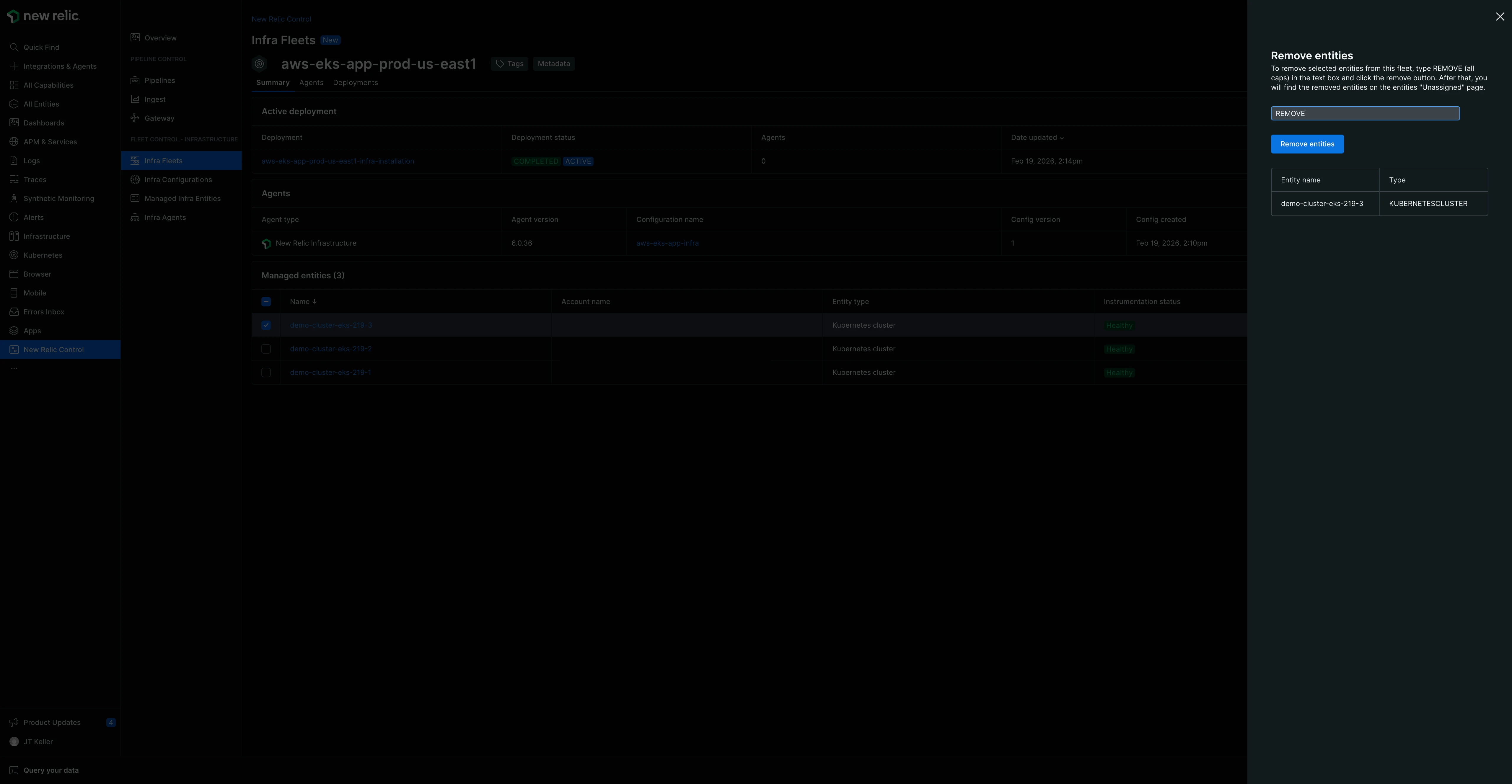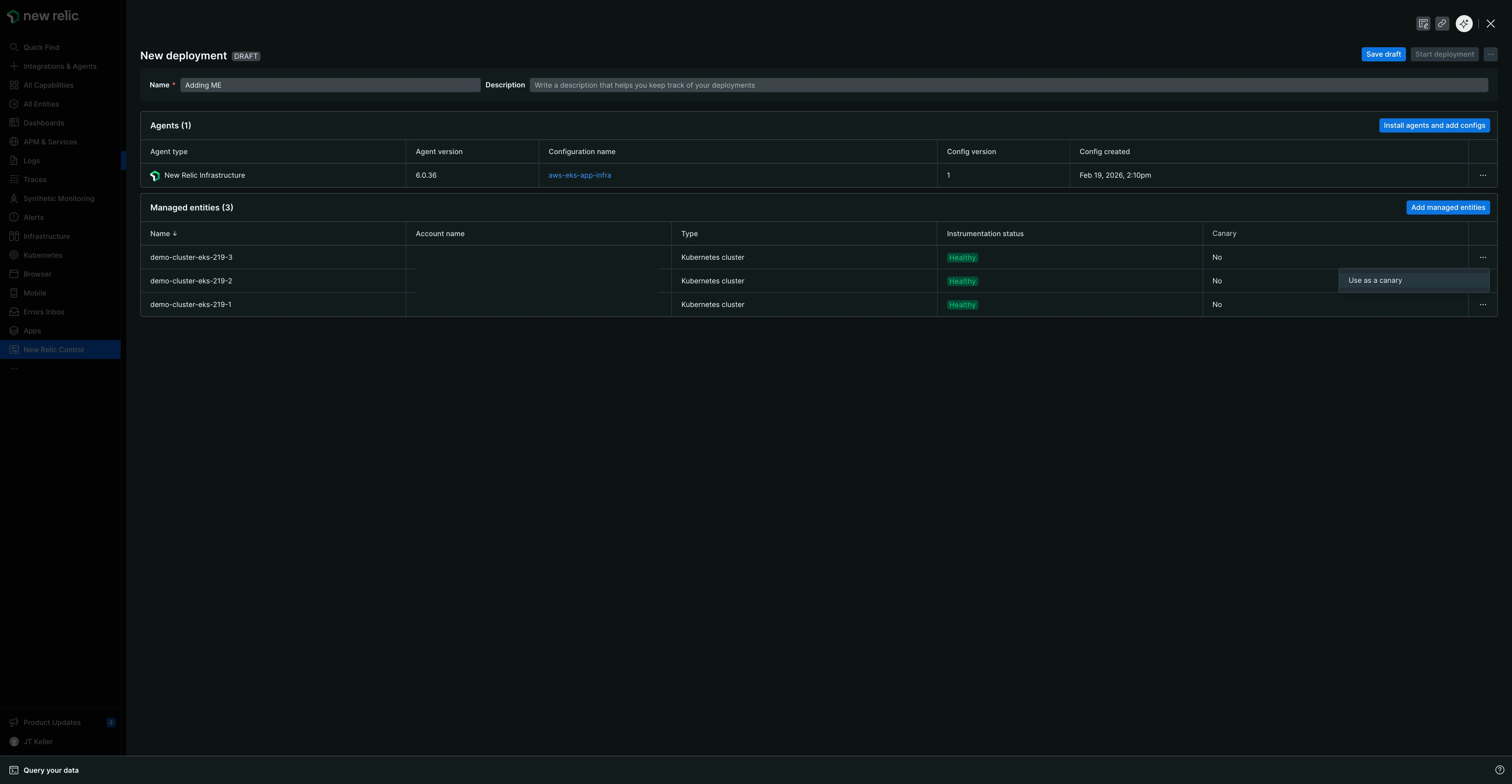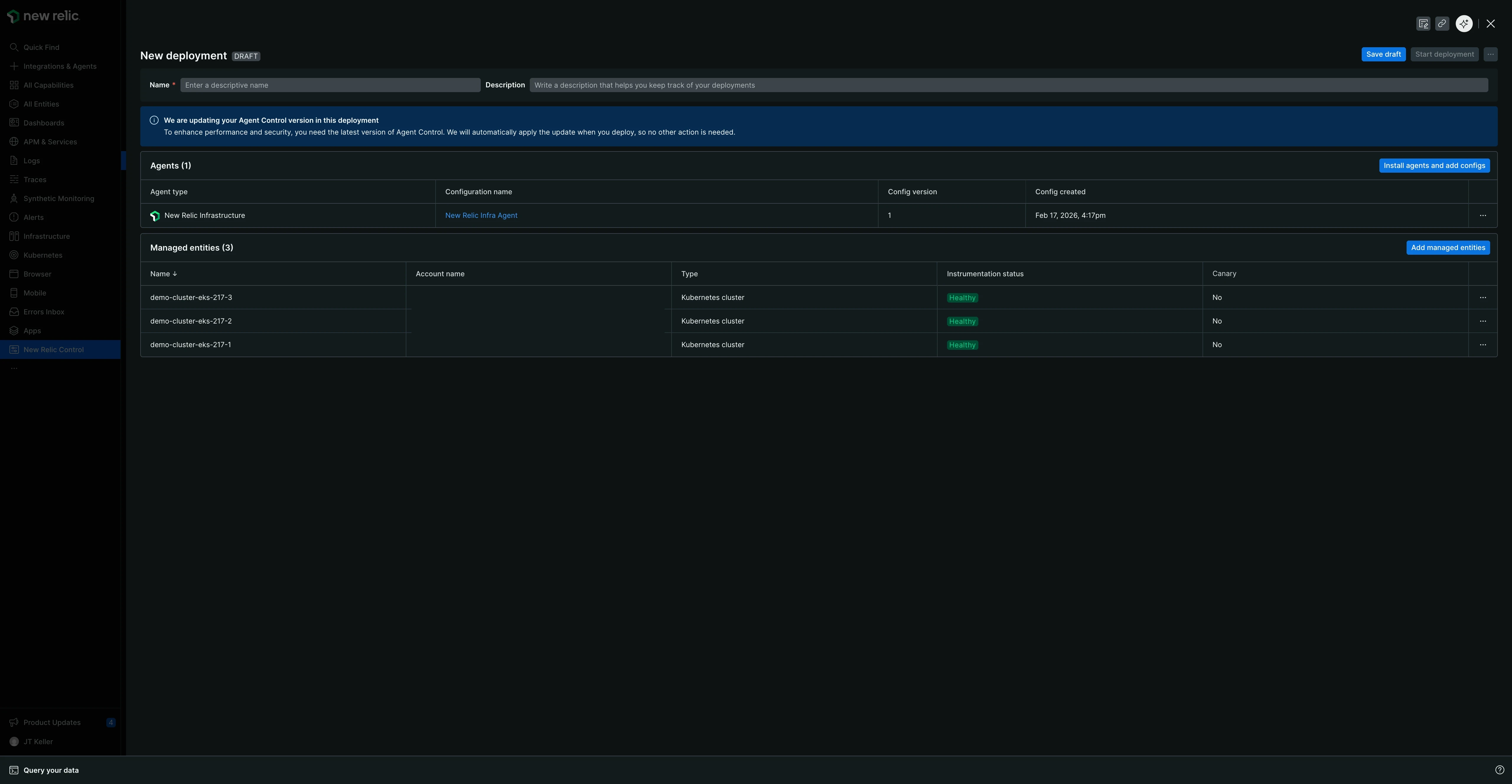 Exclusive infrastructure instrumentation: The system prevents you from deploying both the New Relic Infrastructure agent and the New Relic Distribution of OpenTelemetry Collector (NRDOT) to the same fleet. This validation helps prevent accidentally double-instrumenting your managed entities for infrastructure monitoring.