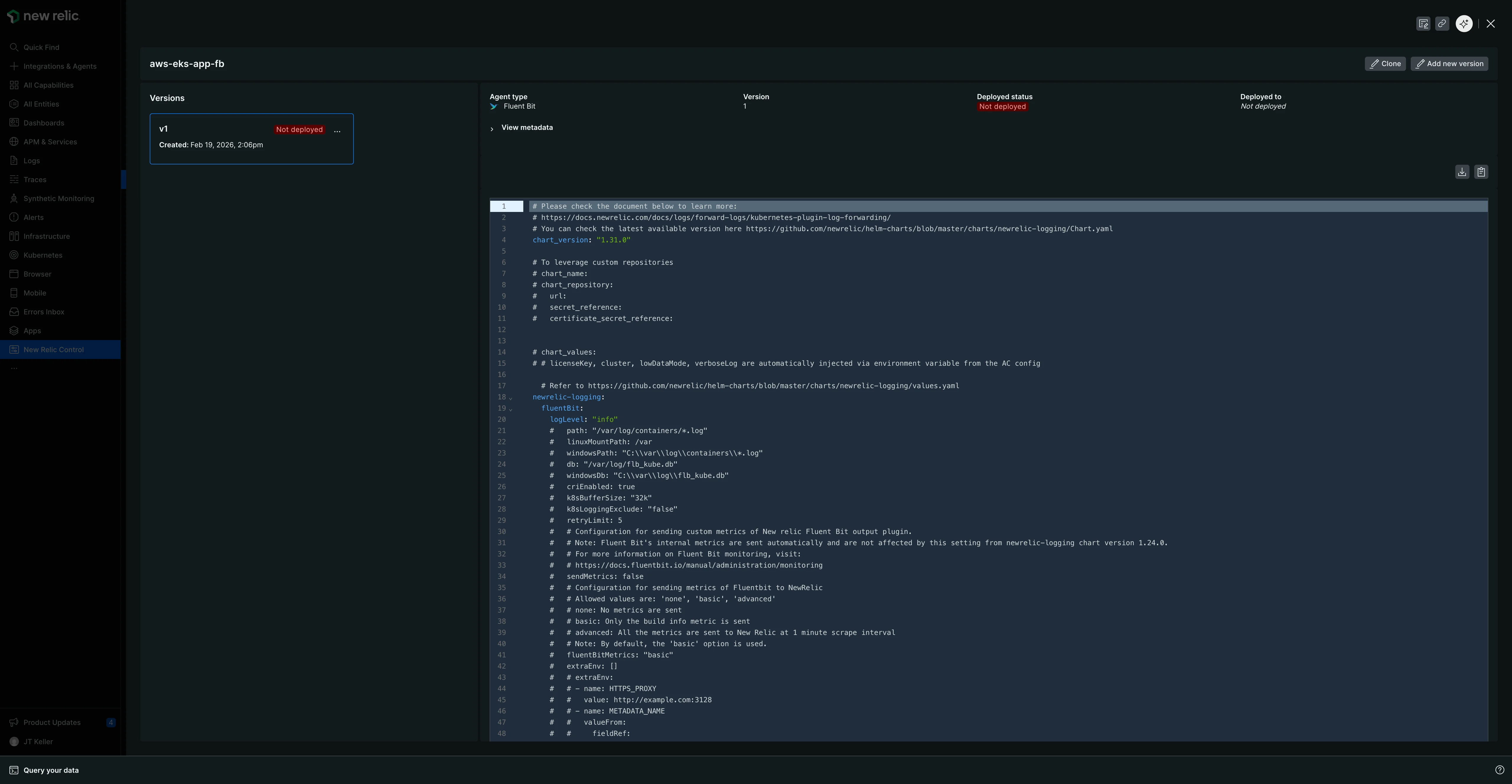 values.yamlfile. During deployment, Fleet Control packages this file with the agent's Helm chart to configure it on your cluster. The templates for Kubernetes agents are structured as a canonical Helm chartvalues.yamlfile. Near the top of the template, you'll find a commented-out link to the agent's Helm chart in the New Relic Helm Charts GitHub repository. This allows you to easily reference the schema, available values, and other agent-specific documentation. - For hosts, the configuration file format is specific to the agent being deployed.