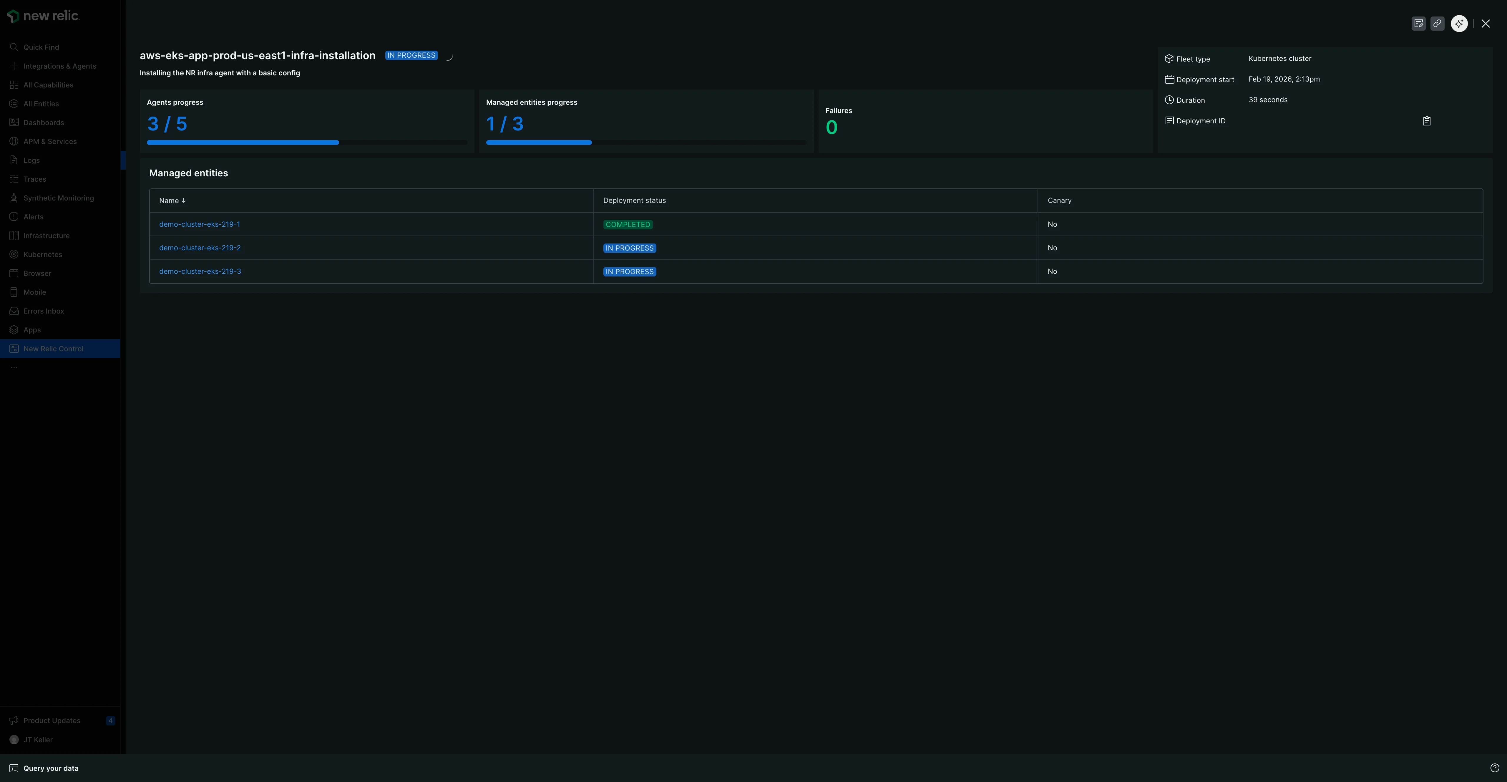An "IN PROGRESS" screen will show the status, the number of managed entities and agents affected, and a deployment ID.