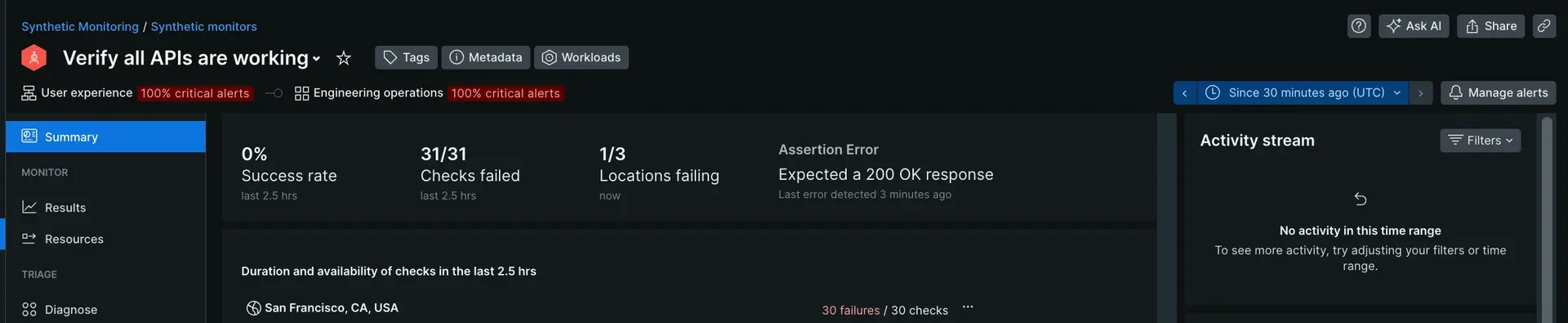 On the summary page, you'll see information about the status of your synthetic monitor. If something created an active incident that triggered an alert, then click the critical alert link to open a new window.
