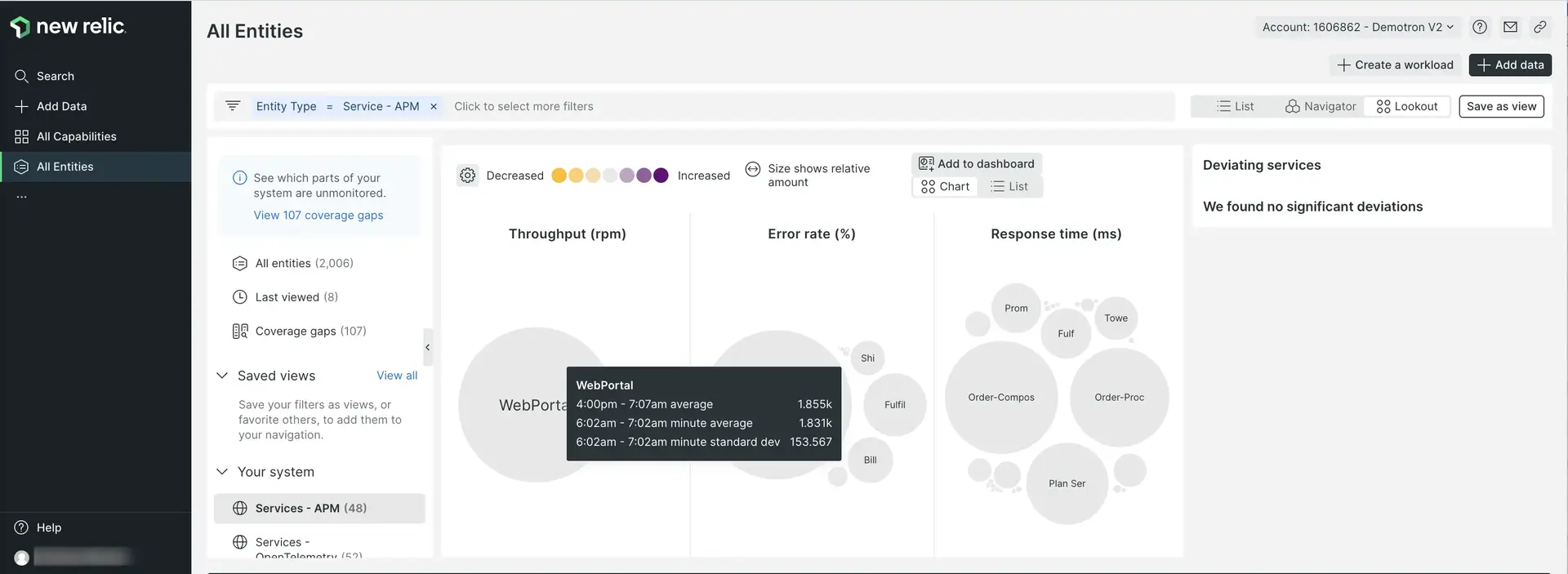 We also have New Relic Lookout, which is another visual way to quickly see how your whole system is doing. This is focused on changes in performances: it draws your attention to entities that have undergone significant shifts in important metrics. Learn more about Lookout.