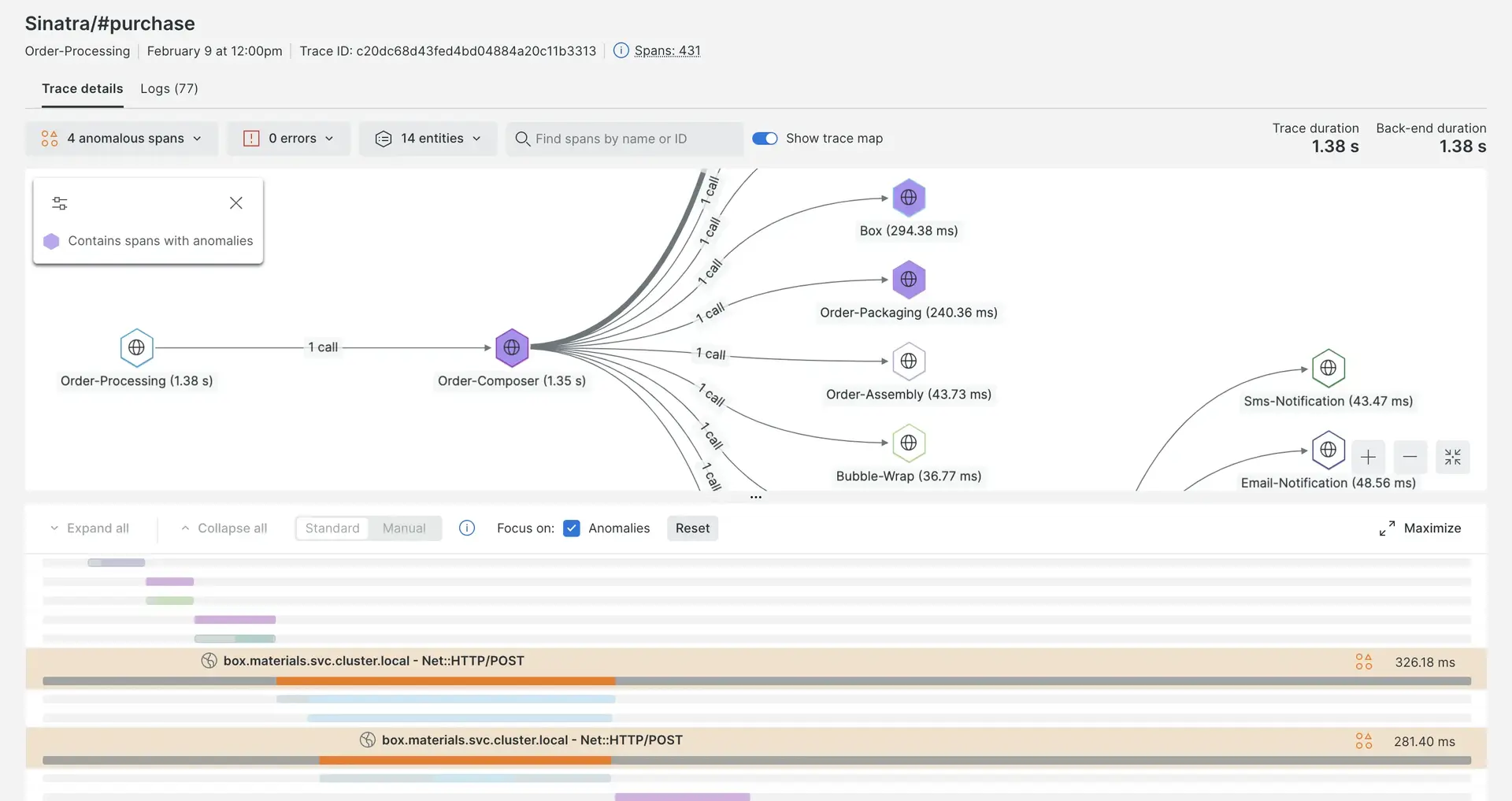 Distributed tracing trace waterfall