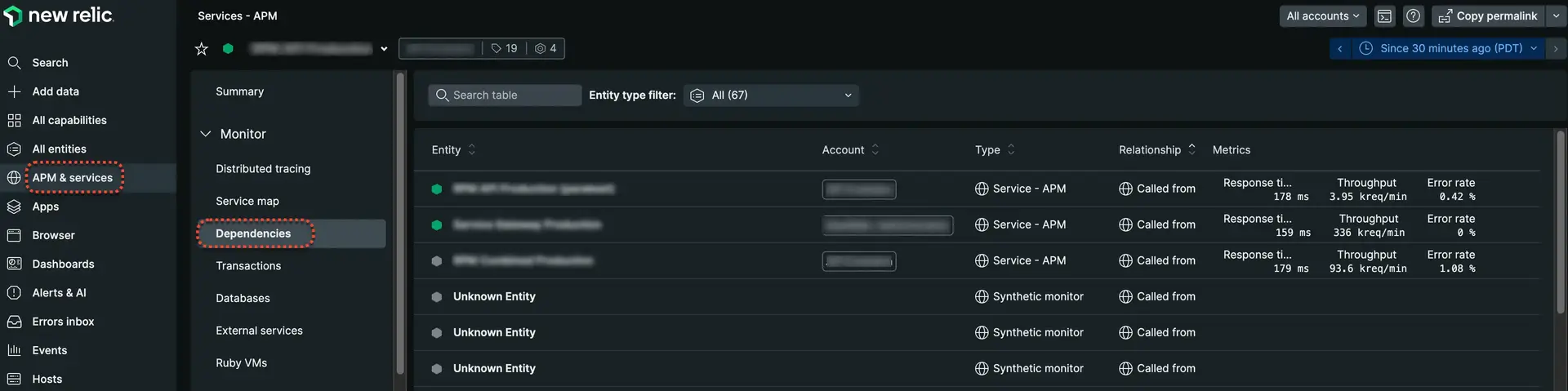 one.newrelic.com > APM & services > Dependencies: View a filterable list of all the apps, services, databases, and hosts connected to an entity, and their color-coded health status.