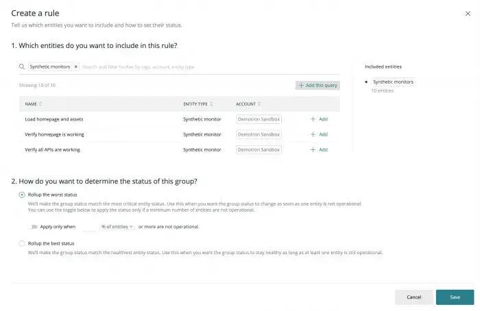 When combined with the grouping by entity type option, this special rule allows you to get a general sense of how each entity type in your workload is doing, without having to configure a rule for each entity type. Therefore, we recommend that you always set a rule for all remaining entities grouped by type, and roll up their worst status to quickly detect when all entities in a layer of your workload stack are not operational.