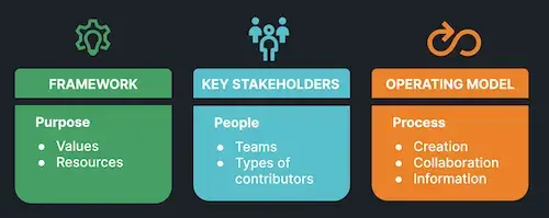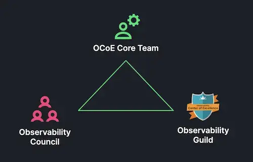 An Observability Center of Excellence primarily consists of three core elements: the framework, key stakeholders, and the operating model.
