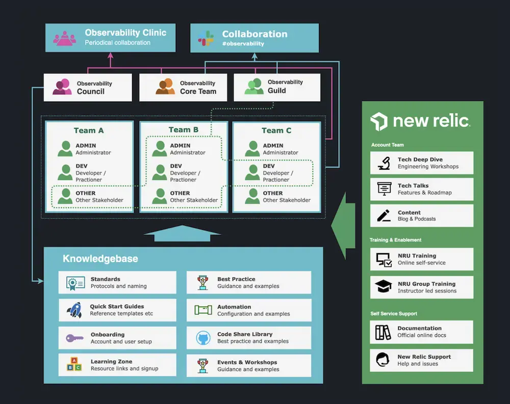 The knowledge base provides a single destination for practitioners to find standards, configuration, examples, code snippets, quick start guides, and other related material that is focused on your organization's configuration of New Relic and implementation of observability best practices. It provides links out to New Relic documentation and learning tools to support self passed enablement and onboarding.