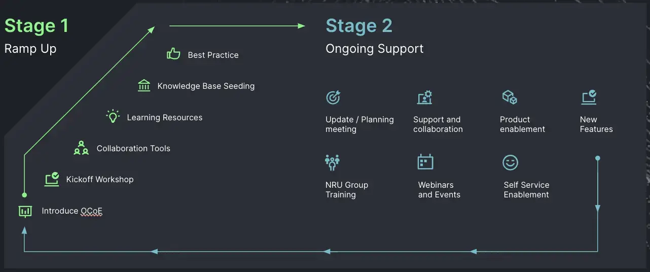 • Stage 2: The ongoing maintenance and support of the OCoE to ensure that the best practices and standards, along with the content and enablement materials are kept up to date and relevant.