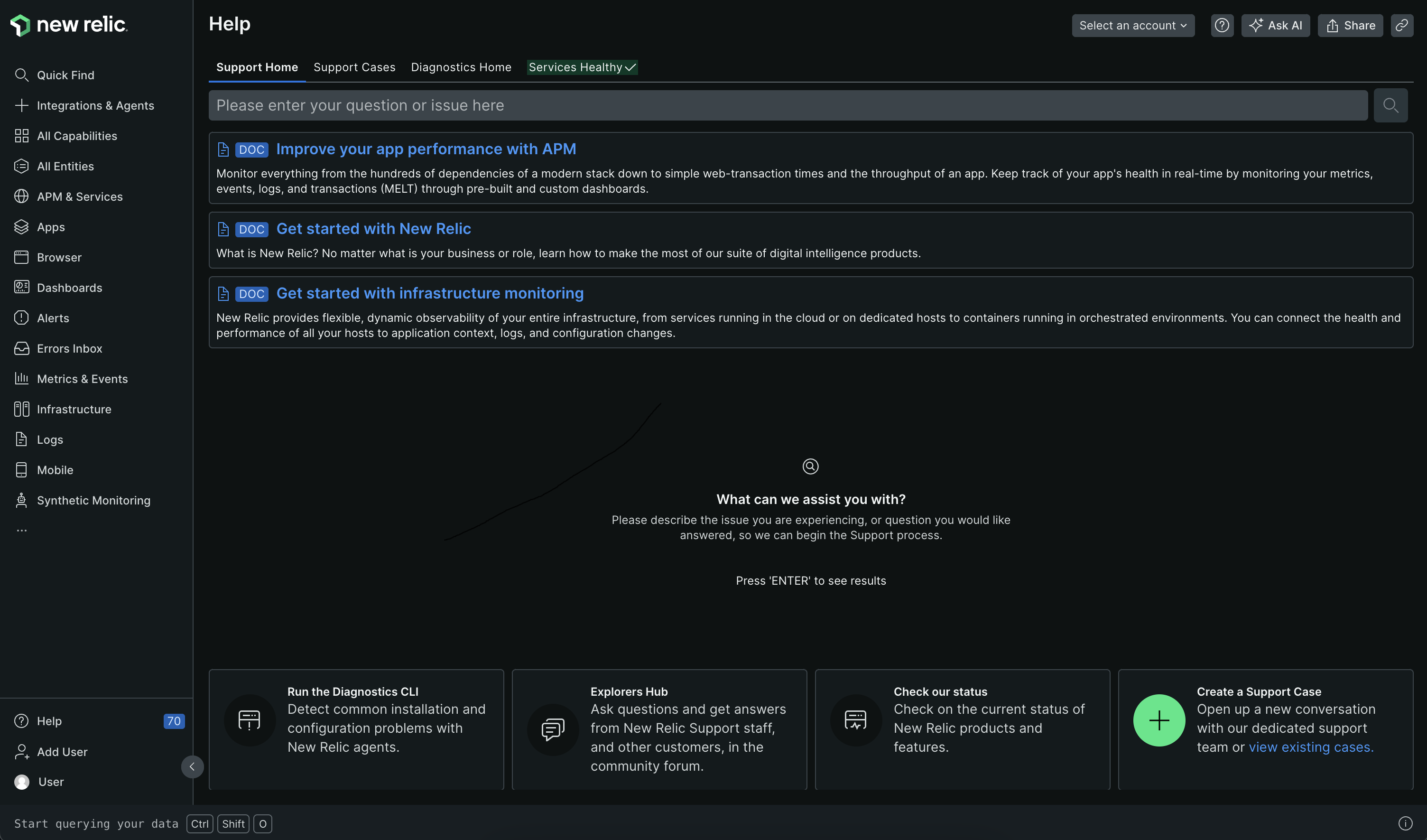 The in-product support view provides visibility into what's new with New Relic, our documentation, and our Explorers Hub. The support sidebar provides rapid access to all our support tools.