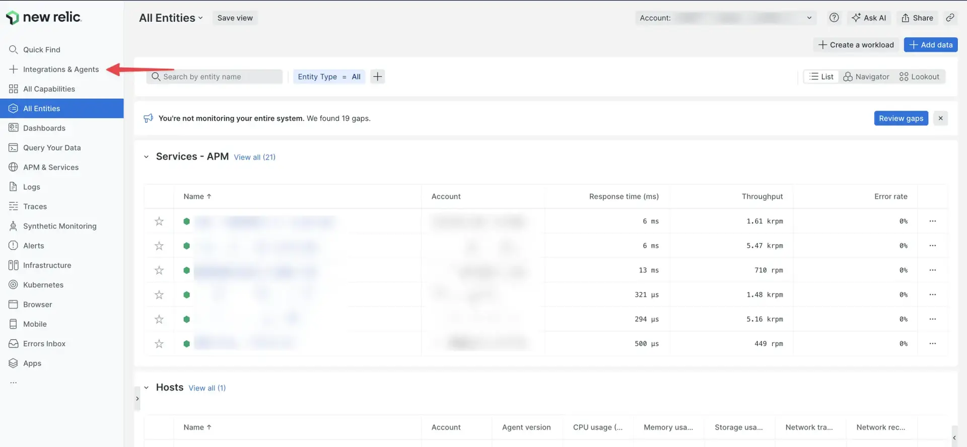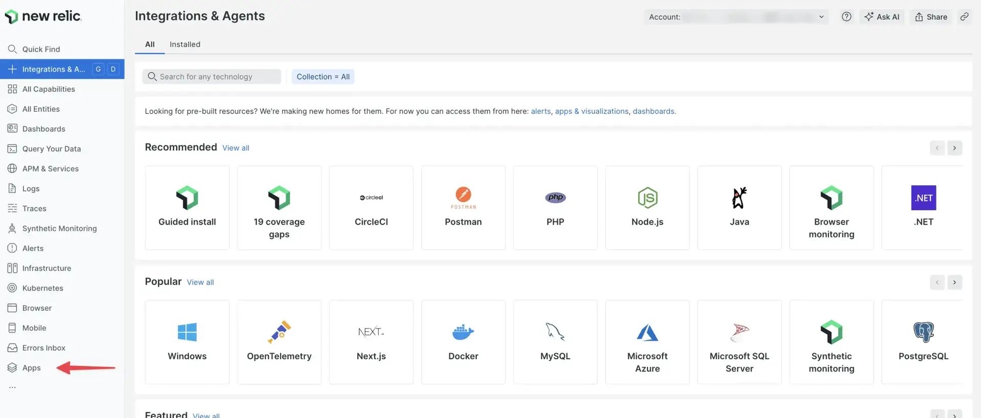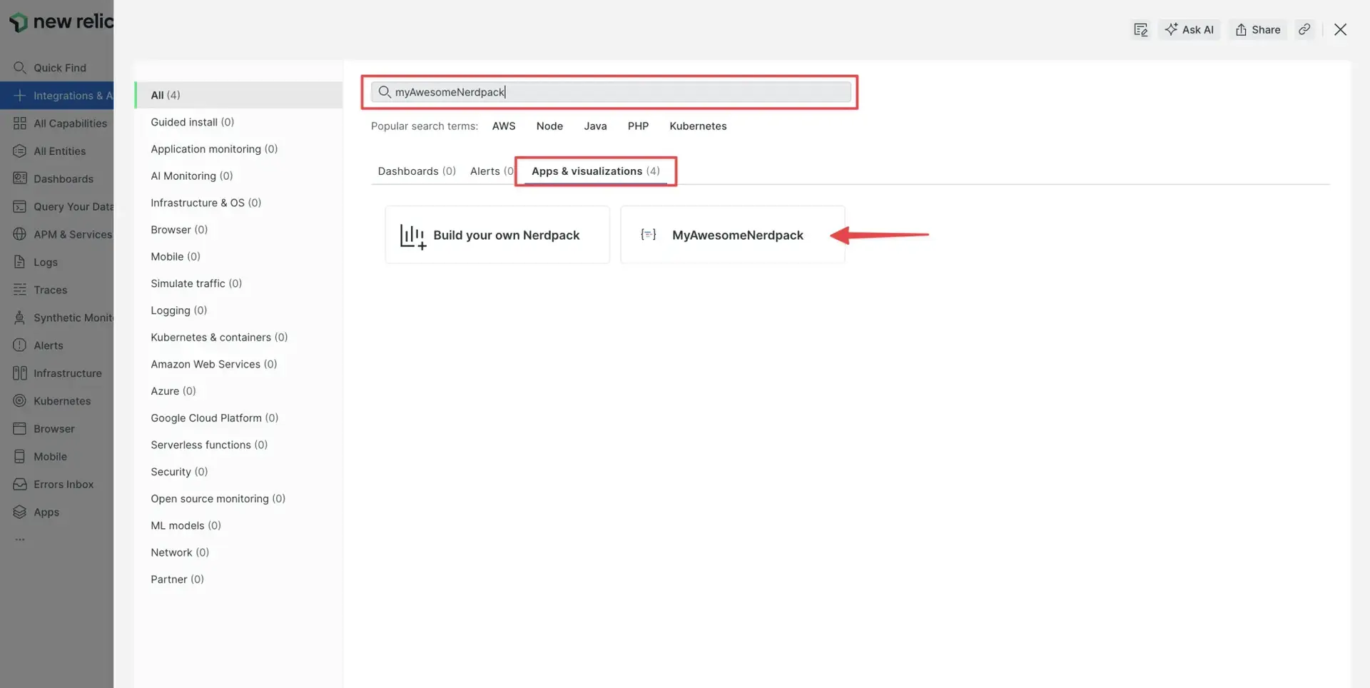 $nr1 nerdpack:publishFound and loaded 2 nr1.json files on MyAwesomeNerdpack (123a4b95-678c-9012-3456-d7e8f90g1hi2) Nerdpack.Nerdpack: ✔ MyAwesomeNerdpack (123a4b95-678c-9012-3456-d7e8f90g1hi2) nr1.jsonLaunchers: ✔ launcher launchers/launcher/nr1.jsonNerdlets: ✔ home nerdlets/home/nr1.json🛠 Built artifact files for: ⁎ 123a4b95-678c-9012-3456-d7e8f90g1hi2--home built ✔ ✔ Nerdpack built successfully!Publishing Nerdpack MyAwesomeNerdpack (123a4b95-678c-9012-3456-d7e8f90g1hi2) ✔ Nerdpack published successfully! ✔ Tagged 123a4b95-678c-9012-3456-d7e8f90g1hi2 version 0.1.0 as STABLE.In New Relic, click Integrations & Agents: