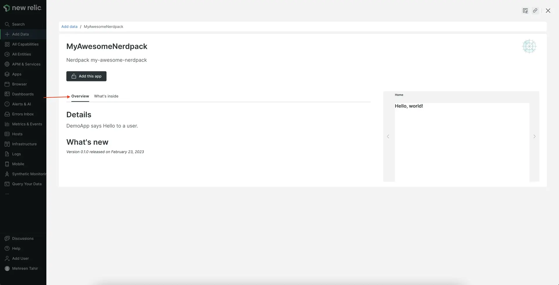 Because you're serving your Nerdpack locally, your colleagues can't see it. When you're ready, publish it to Instant Observability, our unified catalog of integrations, dashboards, alerts, Nerdpacks, and more. Read our documentation to learn about Nerdpack permissions if you have trouble publishing your Nerdpack.