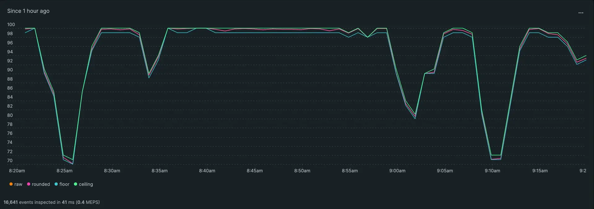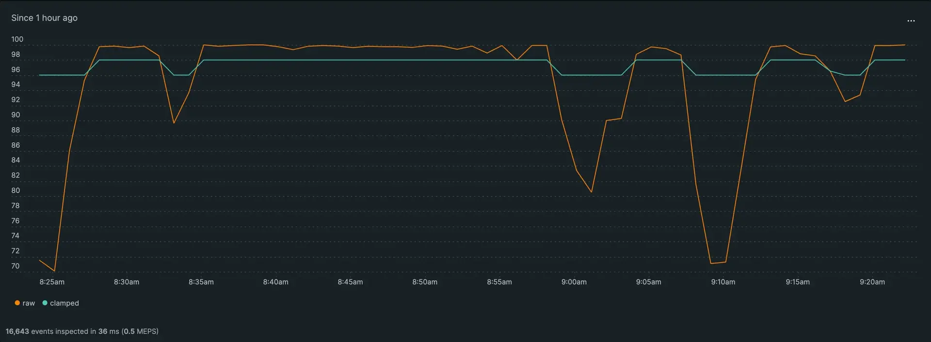 The following example query and chart show the result of clamping both min and max to keep the value in the range 96-98.
