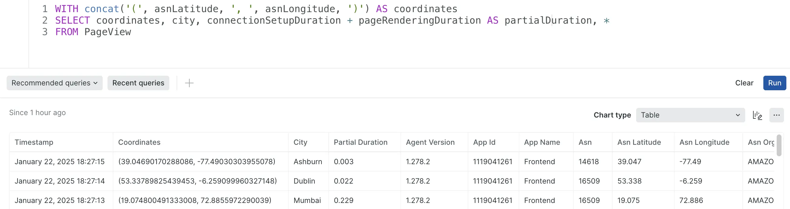 SELECT histogram(duration, 10, 20) FROM PageView SINCE 1 week ago