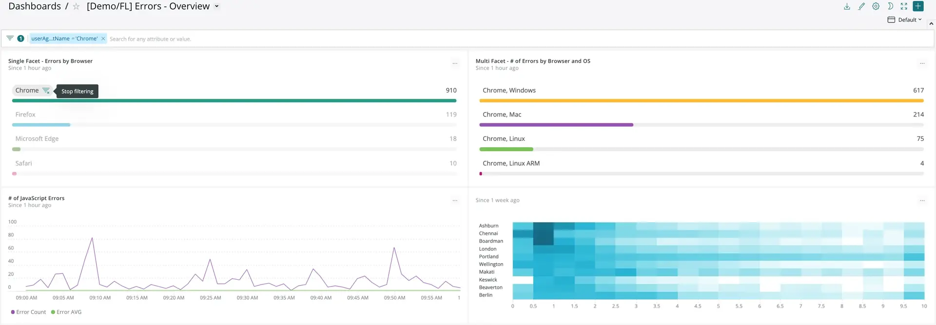 For our dashboards, any NRQL queries containing a FACET clause and meeting other chart-type requirements, you can set up the faceted attributes to filter the current dashboard or a related, linked dashboard. By letting you quickly filter your dashboards, and link to pre-filtered dashboards, your dashboards are more interactive and easy to use.