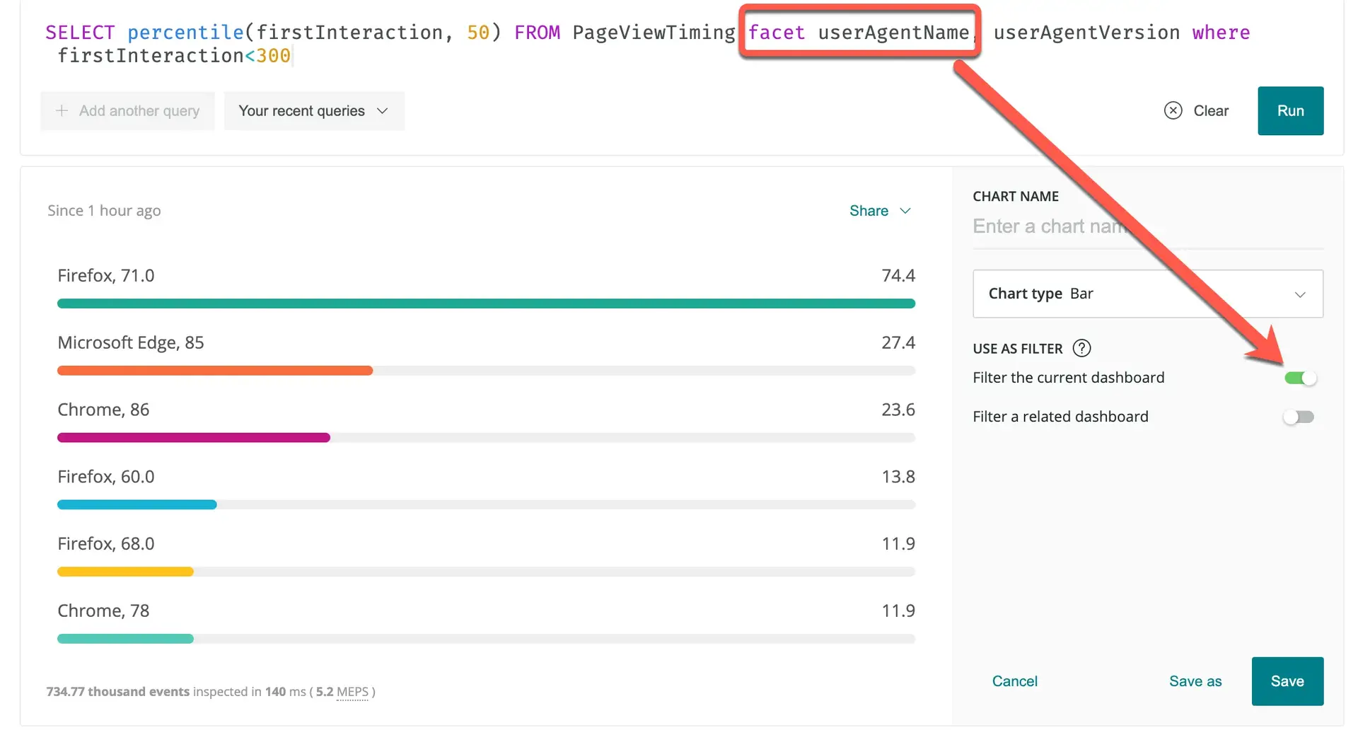 If you select Filter the current dashboard, that chart will be used to filter the current dashboard by the available userAgentName attributes. Here's a view of selecting one of those attributes to filter that dashboard. Notice that the chosen attribute appears as a filter in the search bar at the top.