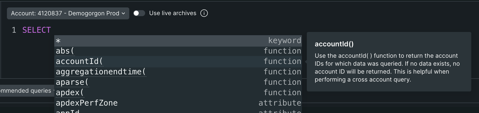 For each statement or function in your query, you can view a list of valid options, with tooltips.